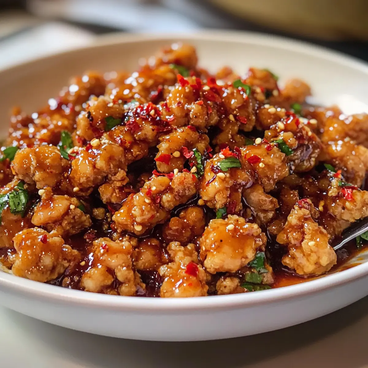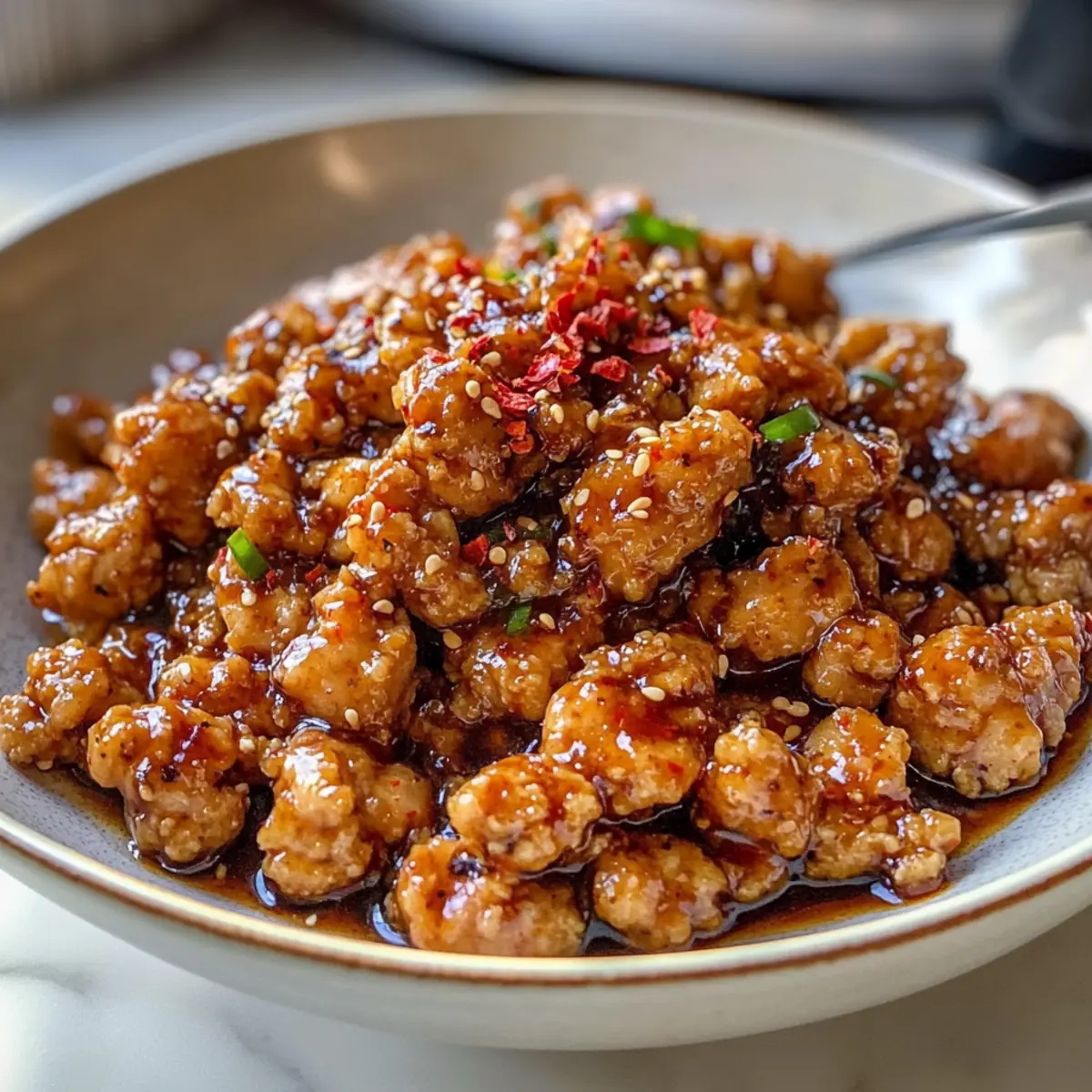 Sobald das Hähnchen schön braun ist, reduziere die Hitze leicht und füge die vorbereiteten Sauce-Zutaten hinzu: Swerve Brown Sugar, Chiliöl, Buffalo Sauce, Ingwer-Pulver und rote Pfefferflocken. Rühre alles gut um und lasse die Mischung etwa 3 bis 5 Minuten köcheln, bis die Sauce dickflüssig wird und sich gut mit dem Hackfleisch verbindet. Achte auf die sich verändernde Konsistenz.