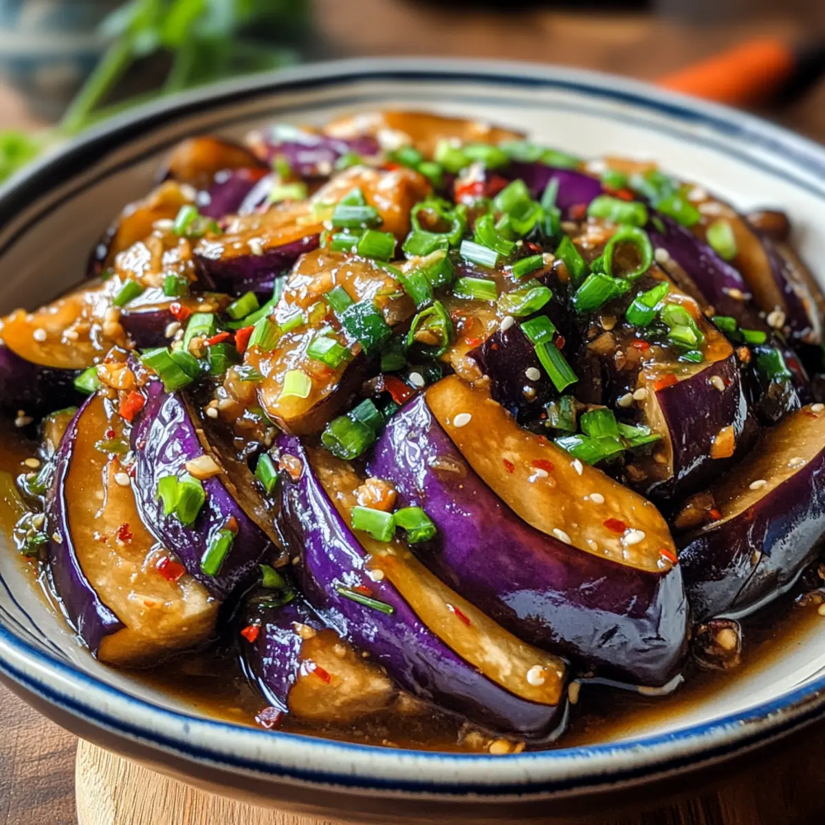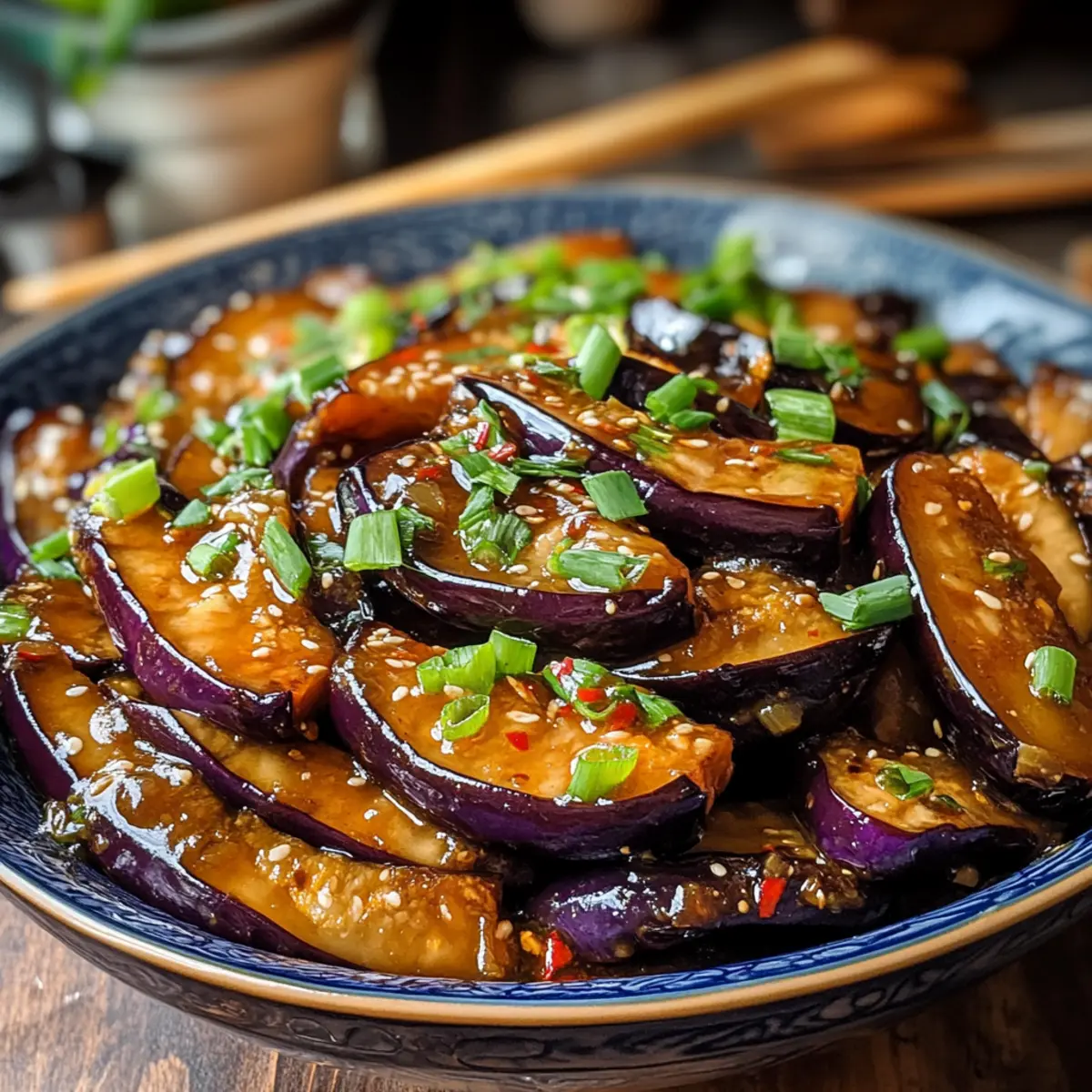 - Nimm die köstliche Aubergine in Knoblauchsauce vom Herd und garniere sie mit gehackten Frühlingszwiebeln für einen frischen Crunch.