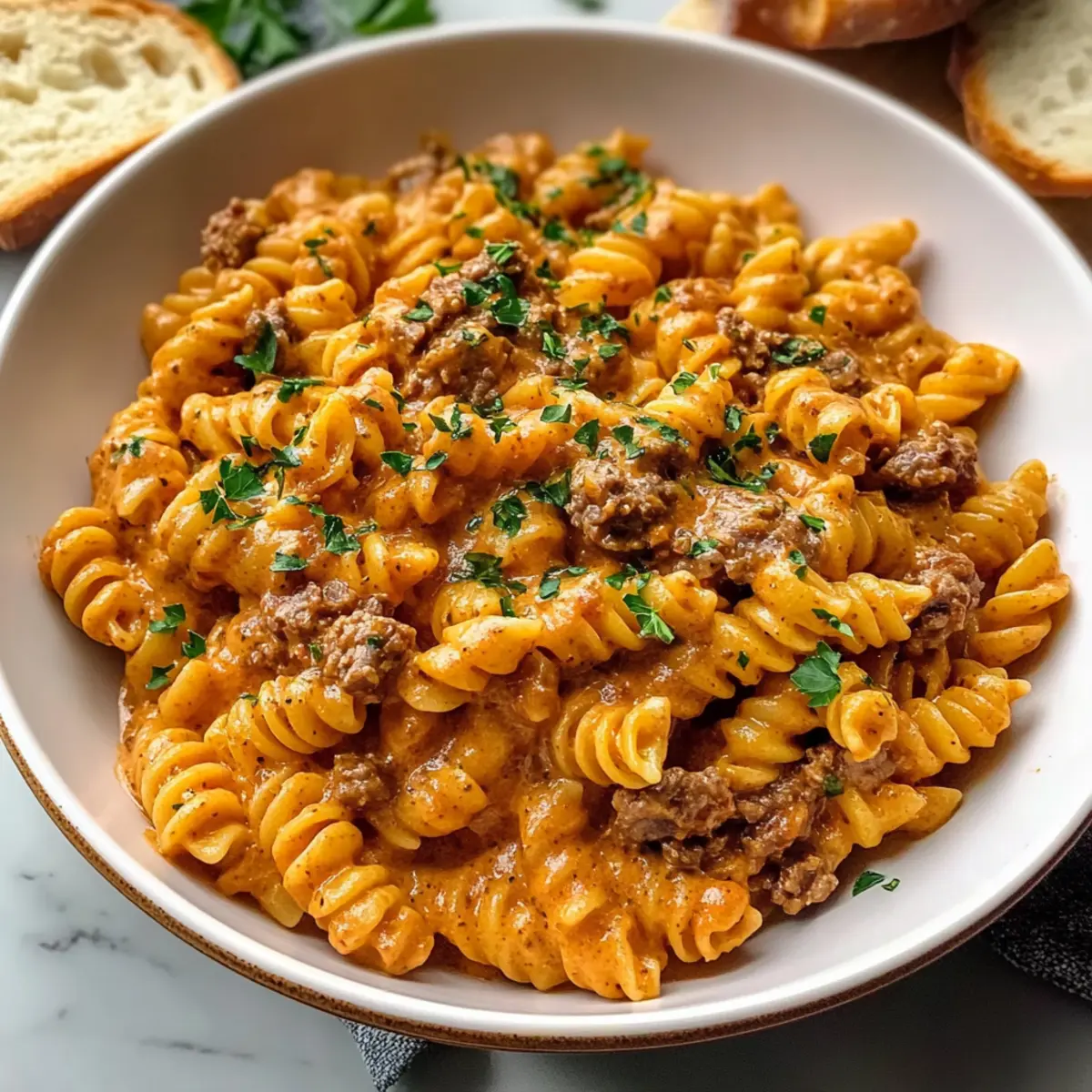 Nimm den Topf vom Herd und probiere die Pasta, um die Gewürze einzustellen. Serviere die Befriedigende Rindfleisch-Pasta in Schüsseln und garniere sie nach Belieben mit frischer Petersilie. Das Finale wird deine Geschmacksnerven verwöhnen!