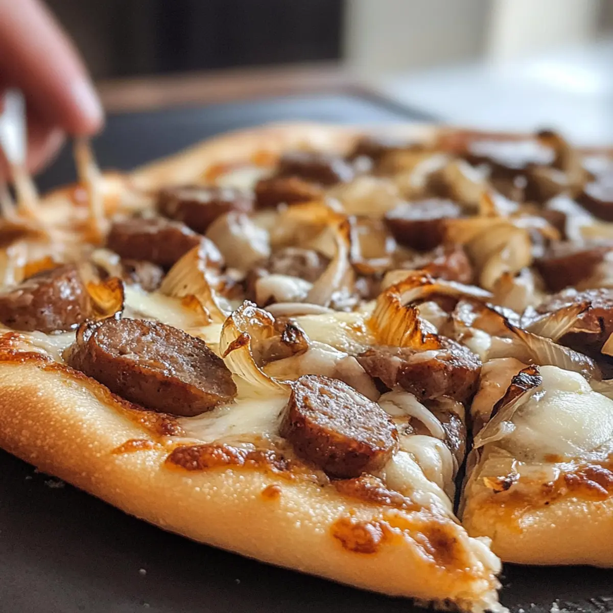 Legen Sie den Pizzaboden auf ein Backblech. Verteilen Sie die frische Mozzarella gleichmäßig über den Boden und geben Sie dann die karamellisierten Zwiebeln und die gebräunten Bratwurstscheiben darauf. Achten Sie darauf, alles gut zu verteilen, damit jede Ecke ein Stück des köstlichen Belags erhält.