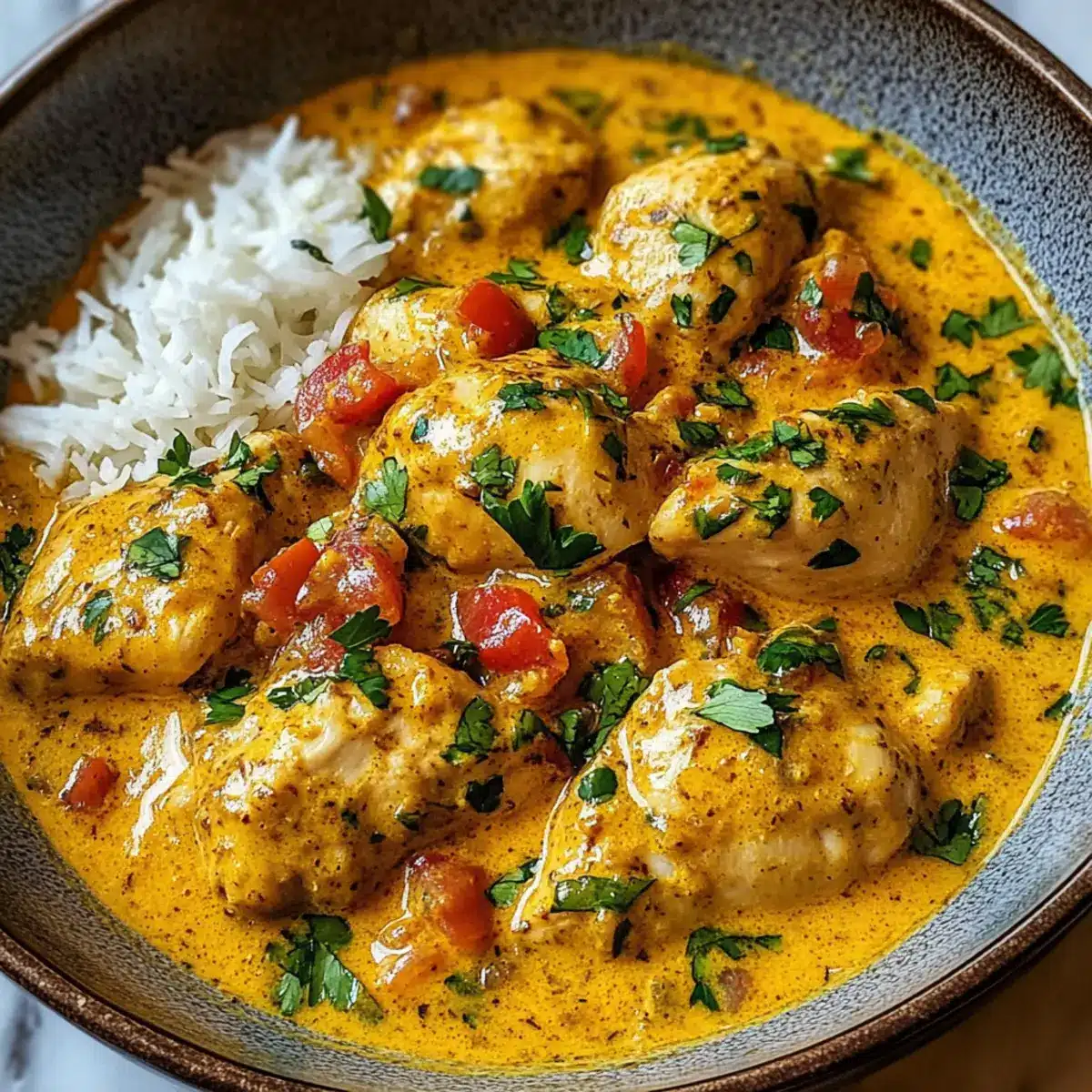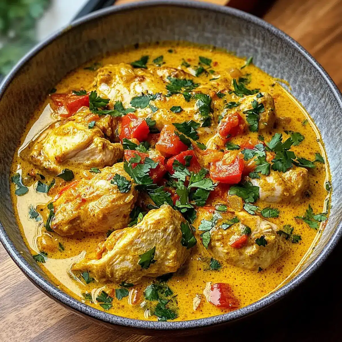 Servieren Sie das Hähnchen mit frischer Petersilie garniert und genießen Sie es über fluffigem Reis oder mit warmen Fladenbroten. Stellen Sie sicher, dass jeder Bissen die cremige Kokos-Curry-Sauce einfängt, die dem Gericht seine unverwechselbare Note verleiht.