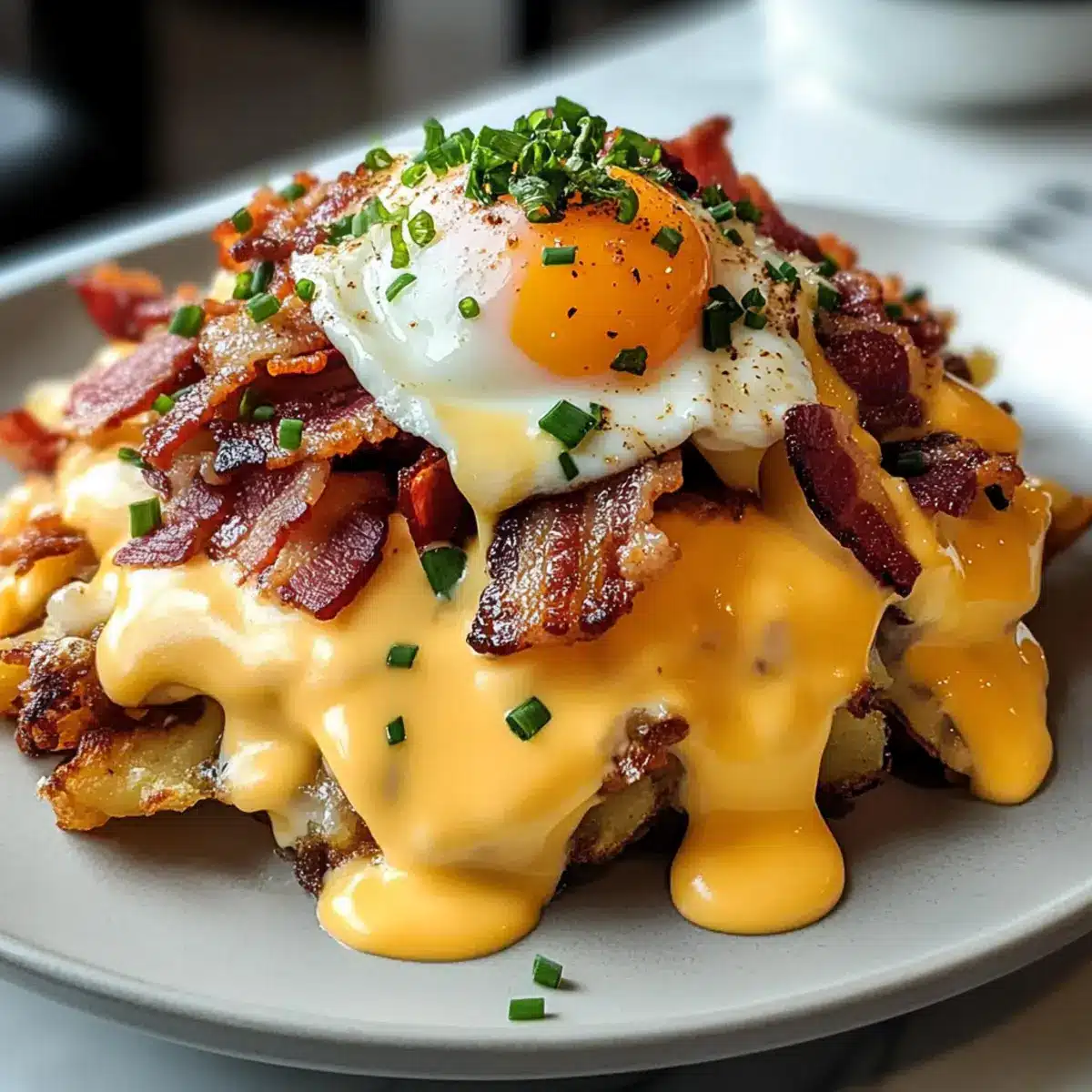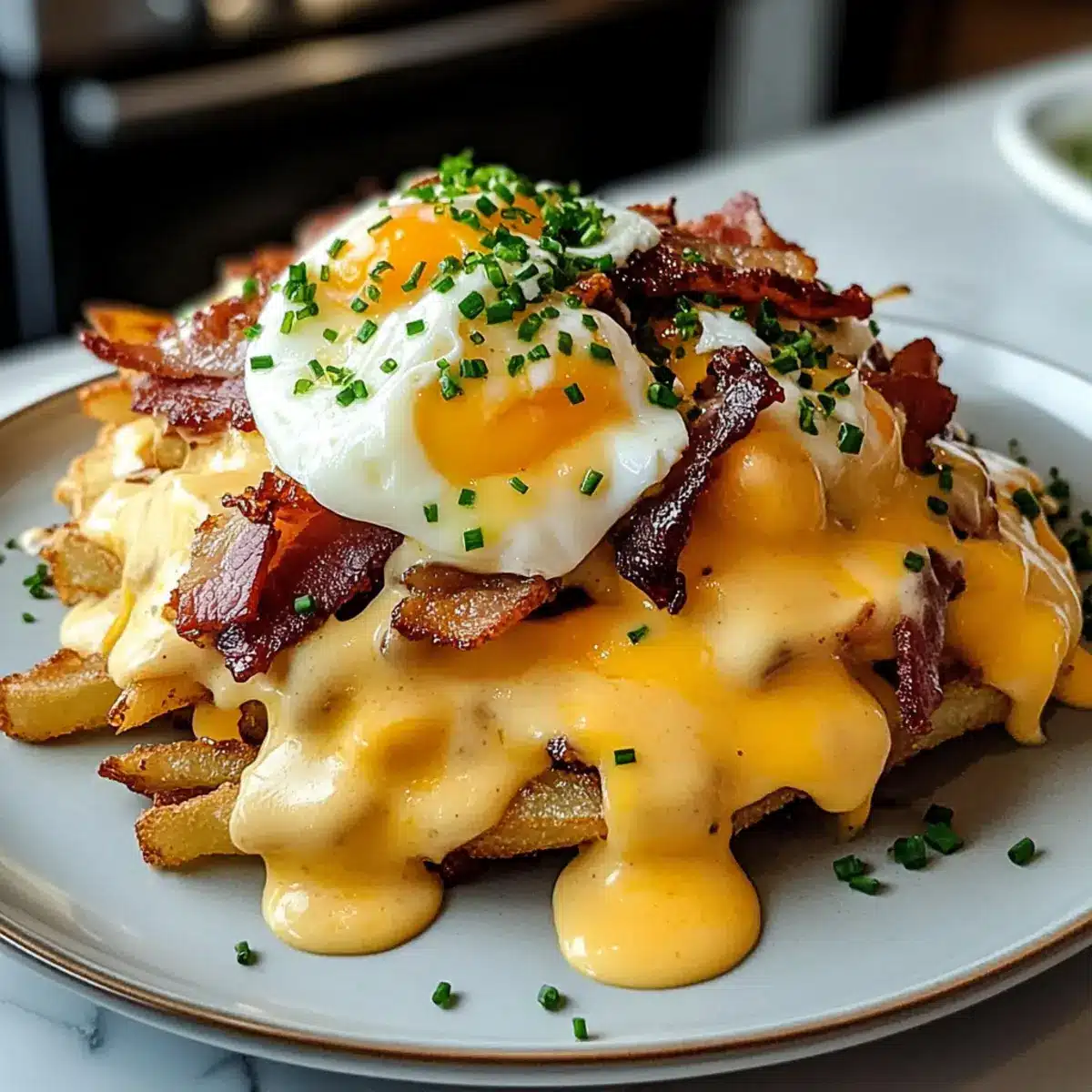 Frühstücks-Poutine mit cremiger Hollandaise-Sauce