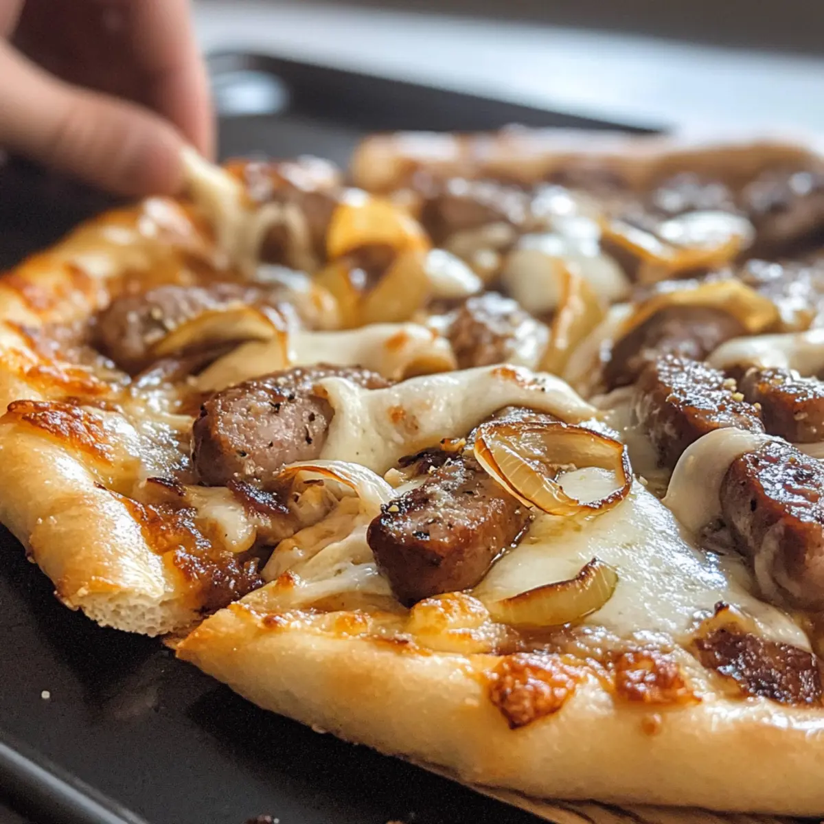 Bier-Bratwurst und karamellisierte Zwiebel Pizza genießen