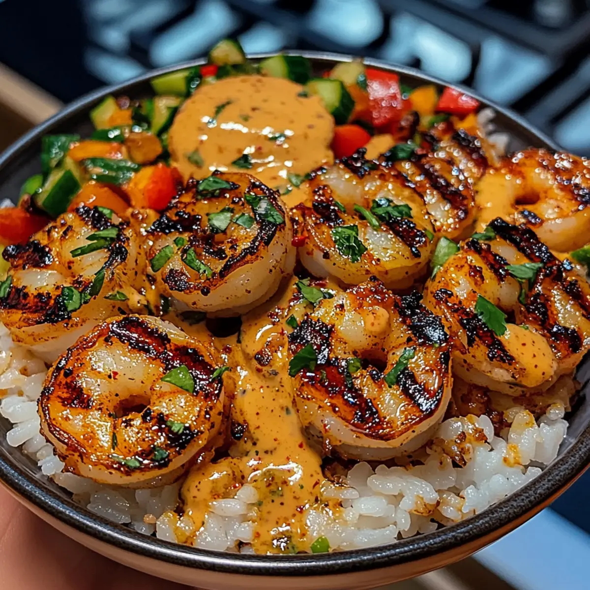 Gegrillte Garnele Reis Schalen mit süßem Chili Limetten Sauce
