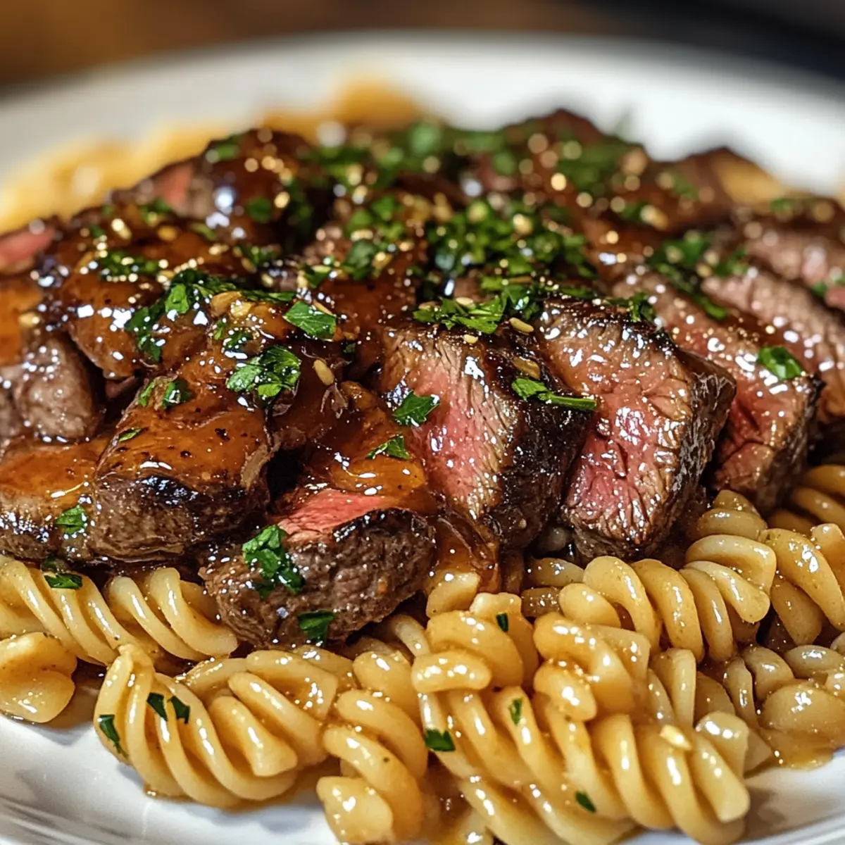 Klebriger Honig Knoblauch Steak mit Rotini genießen