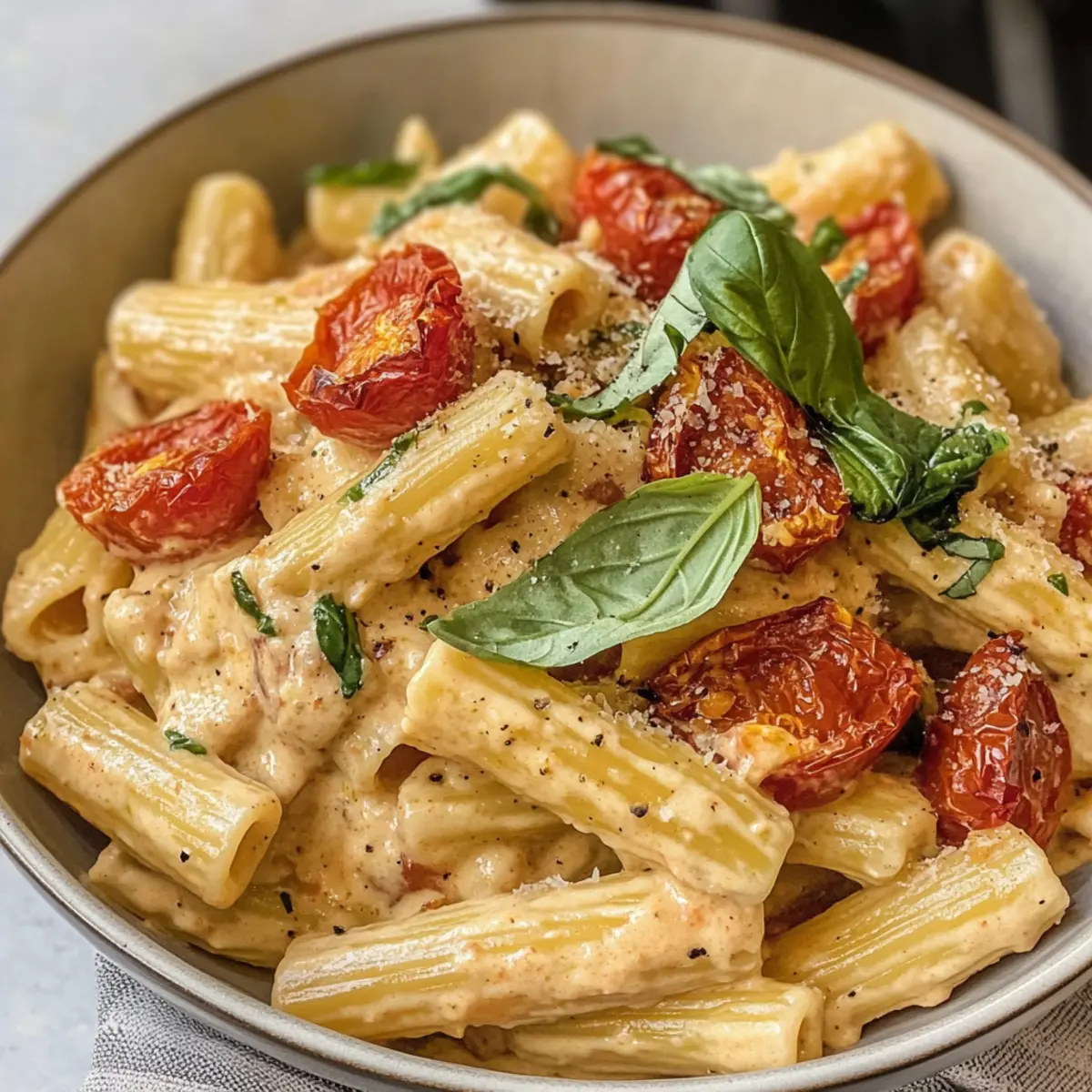 Gebackene Hummus-Pasta mit Tomaten und Knoblauch
