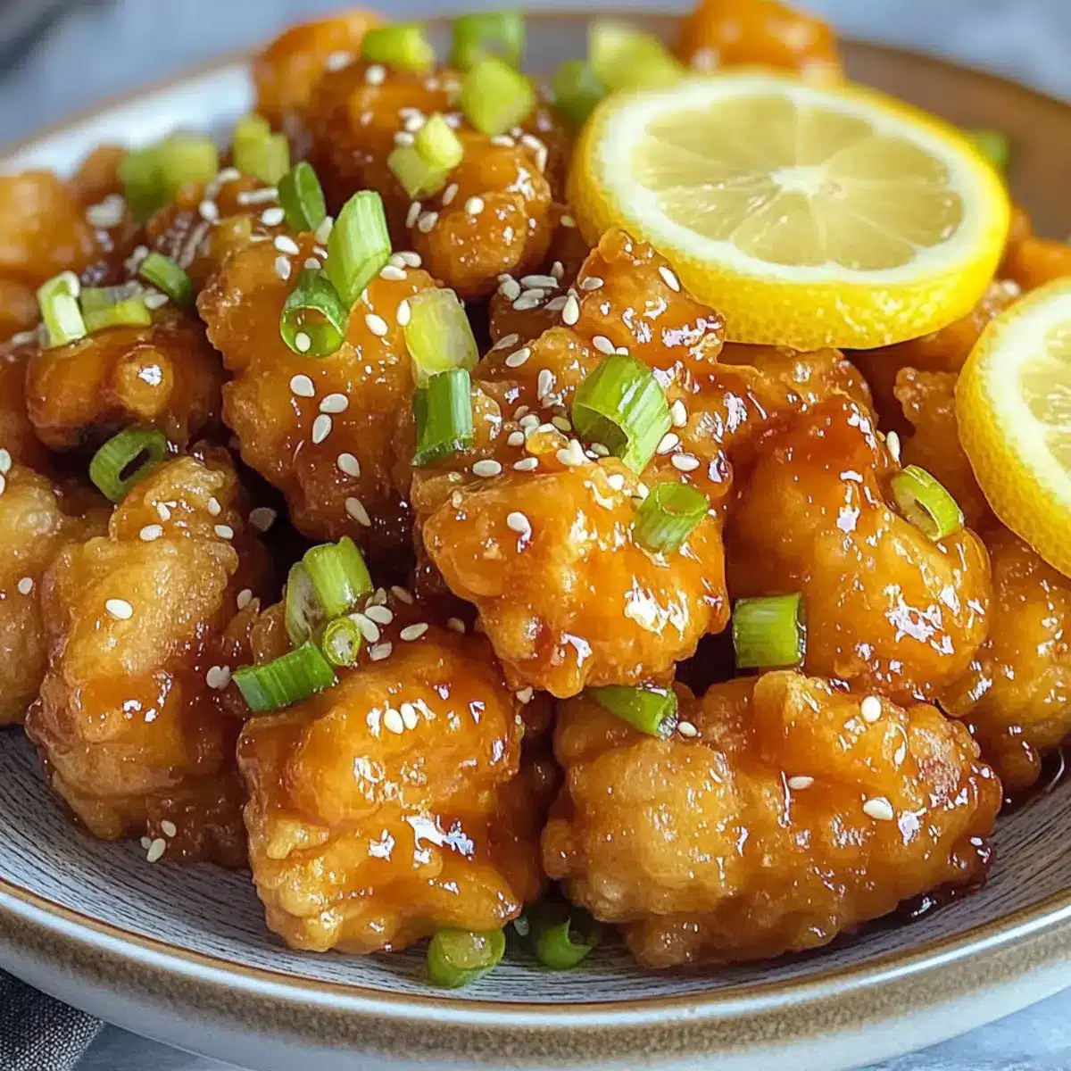 Das Chinesische Zitronenhühnchen auf einem Servierteller anrichten und mit Zitronenscheiben, dünn geschnittenen Frühlingszwiebeln und Sesamkörnern garnieren. Diese Zutaten bringen nicht nur zusätzlichen Geschmack, sondern sorgen auch für eine ansprechende Präsentation.