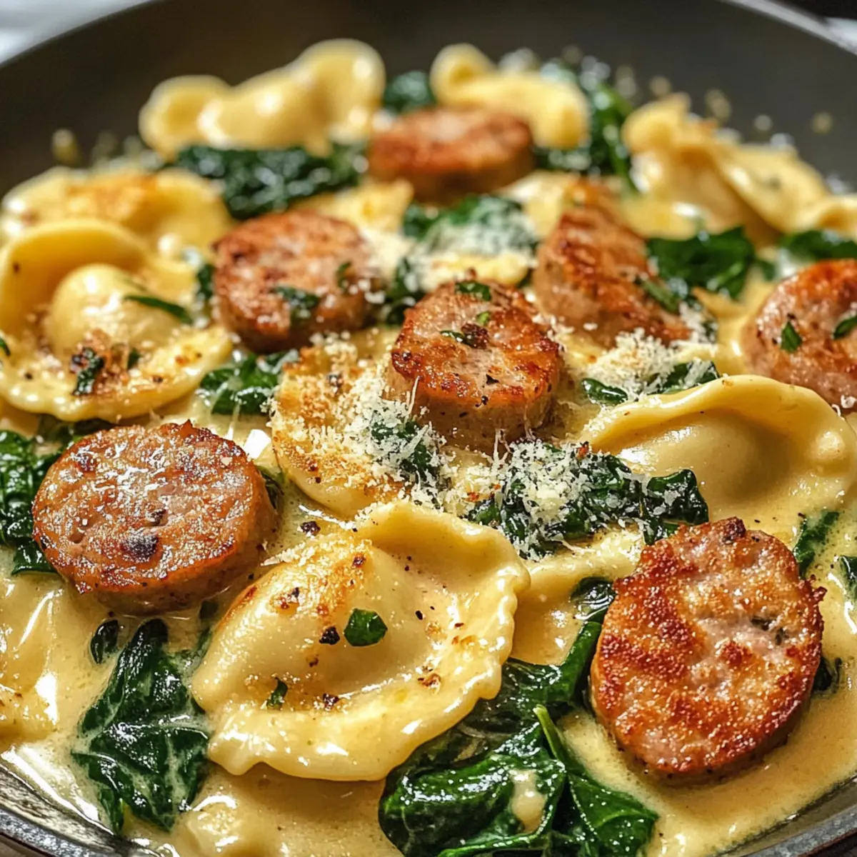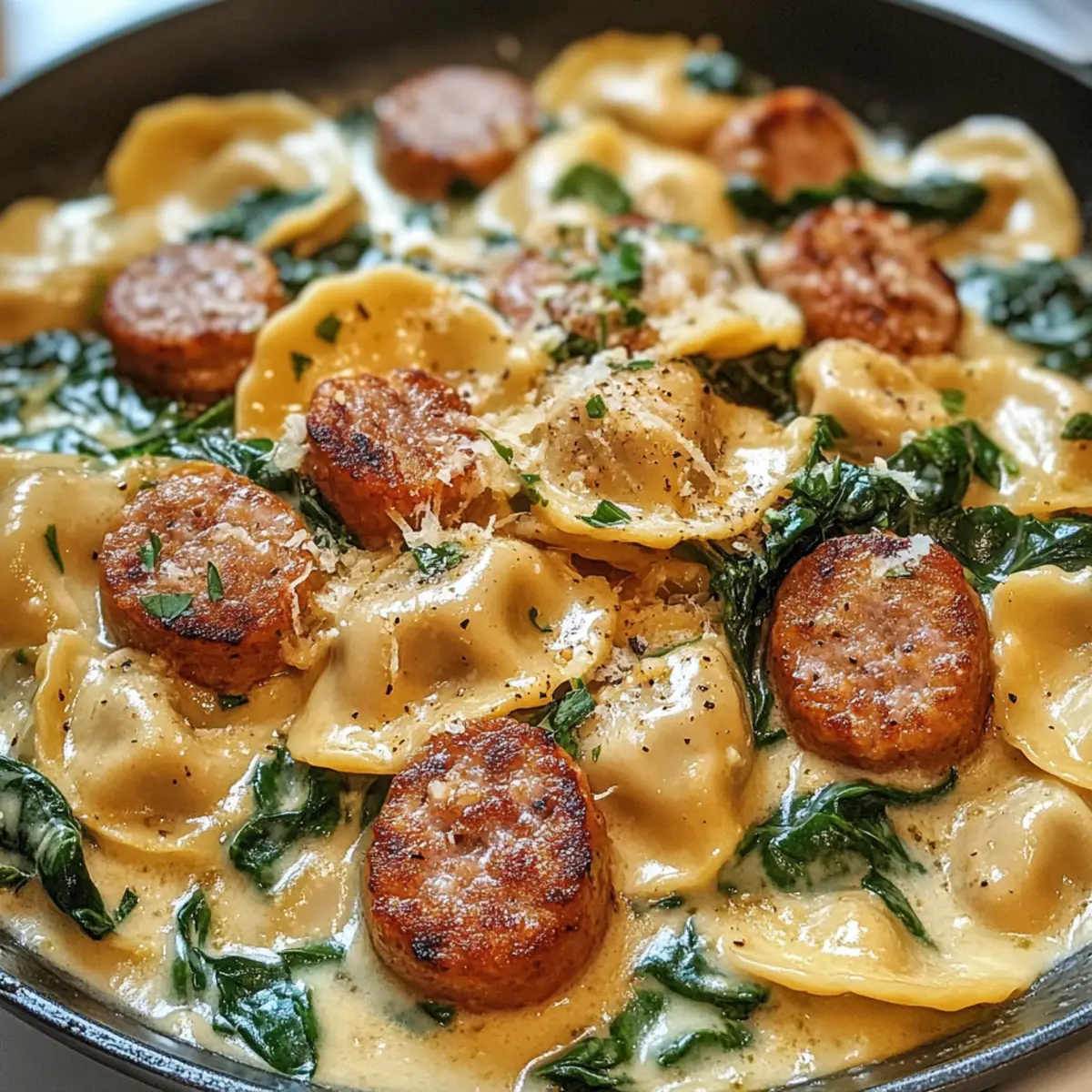 Reduziere die Hitze und füge den frischen Spinat hinzu. Koche alles zusammen, bis der Spinat 1-2 Minuten lang verwelkt ist. Achte darauf, dass der Spinat schön leuchtend grün bleibt, damit er einen frischen Farbklecks in deiner Cremige Pierogi und Truthahnwurst Pfanne Freude bietet.