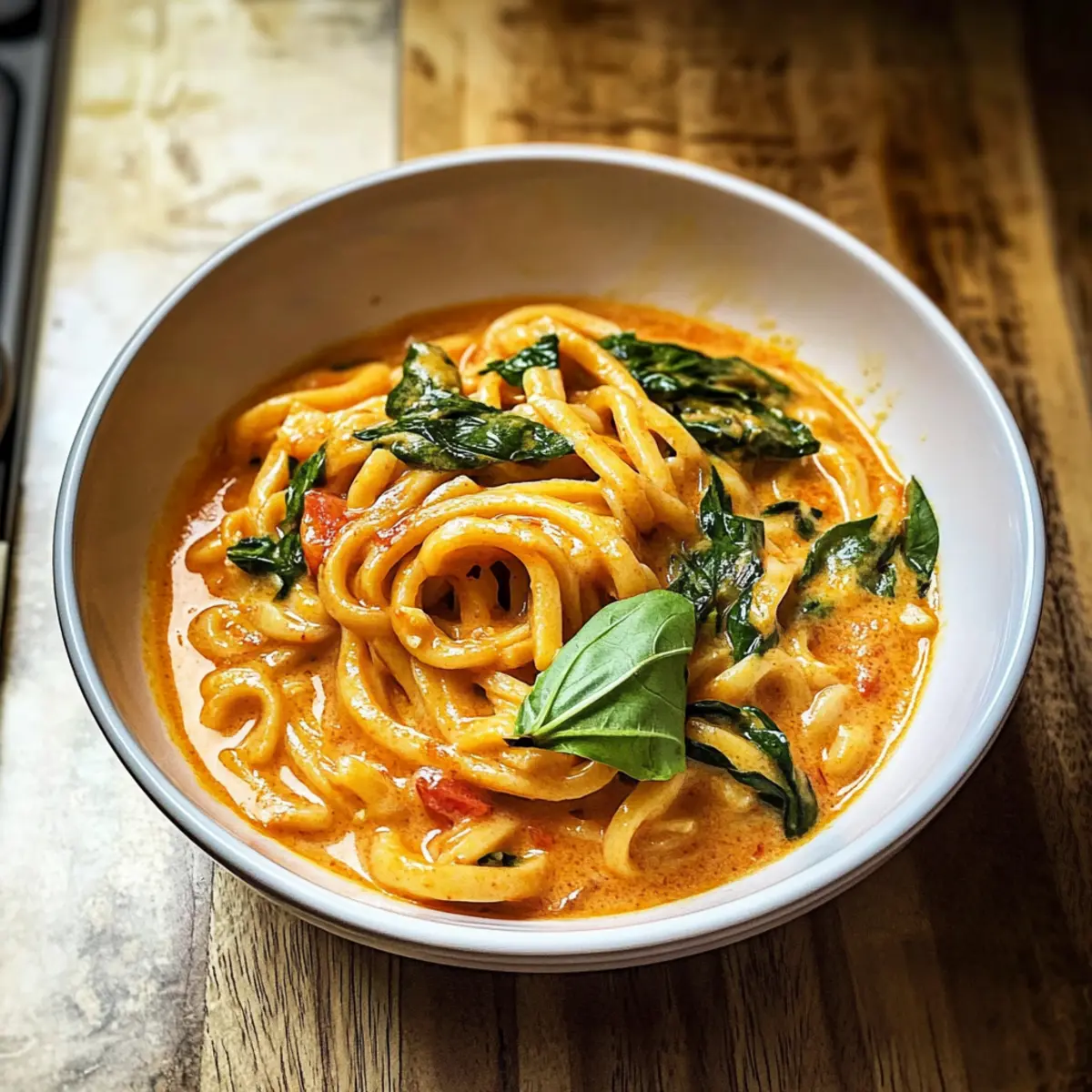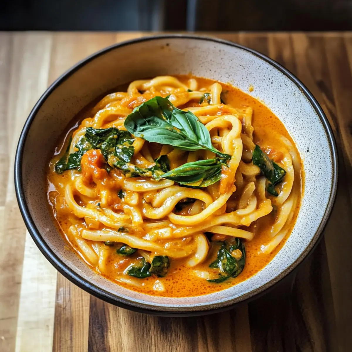 Jetzt den Spinat in die Sauce geben und unter Rühren für etwa 2 Minuten kochen, bis er zusammengefallen ist. Anschließend die Udon-Nudeln hinzugeben und alles gut vermengen, damit die Nudeln gleichmäßig mit der Sauce bedeckt sind. Frische Basilikumblätter und schwarzen Pfeffer nach Belieben untermischen. Sofort servieren und genießen!