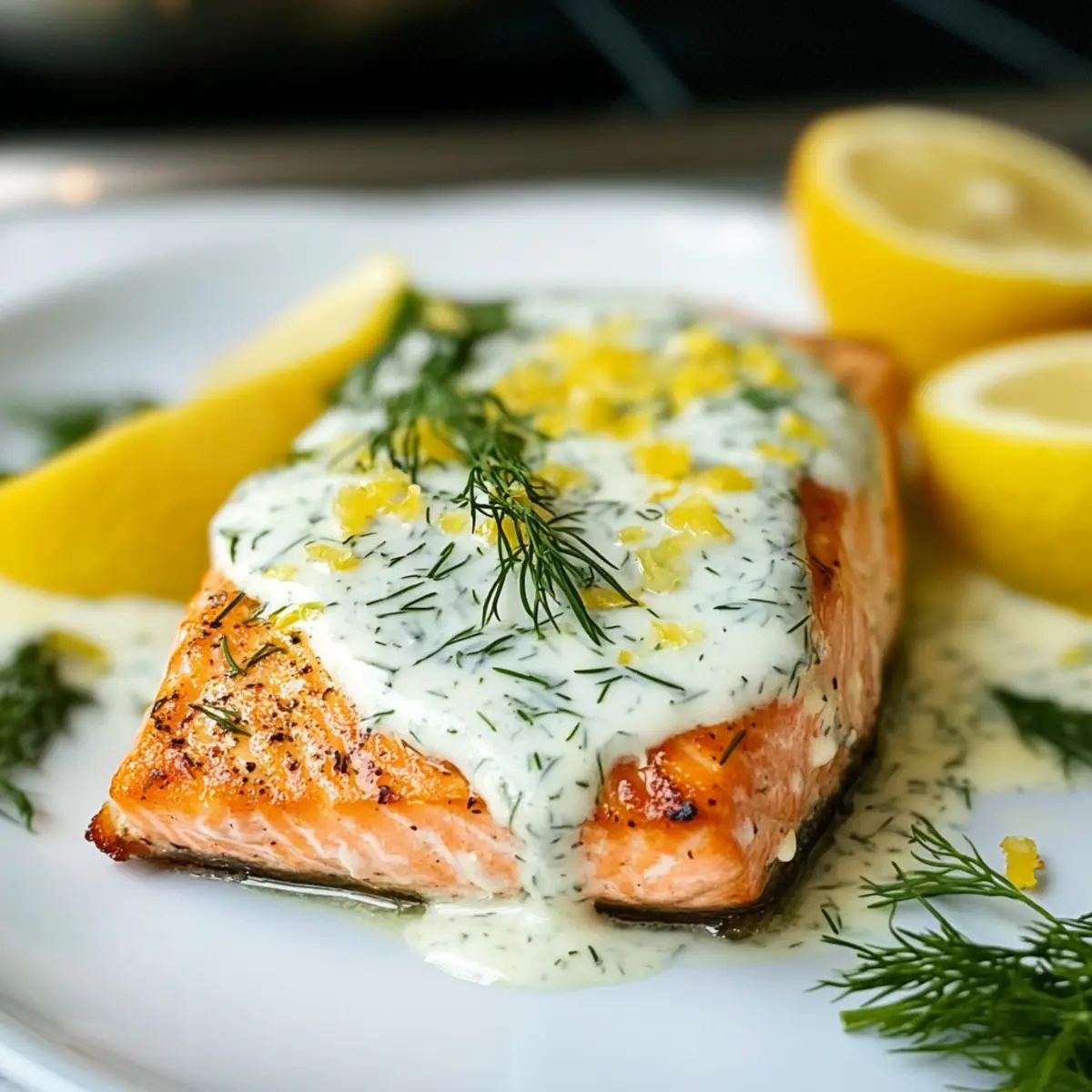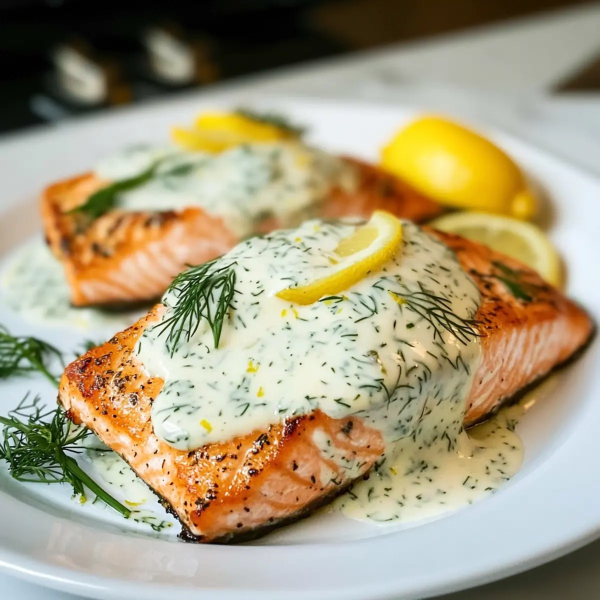 - Nimm die gebratenen Lachsfilets aus der Pfanne, lege sie auf eine Servierplatte, und übergieße sie mit der Dillsoße.