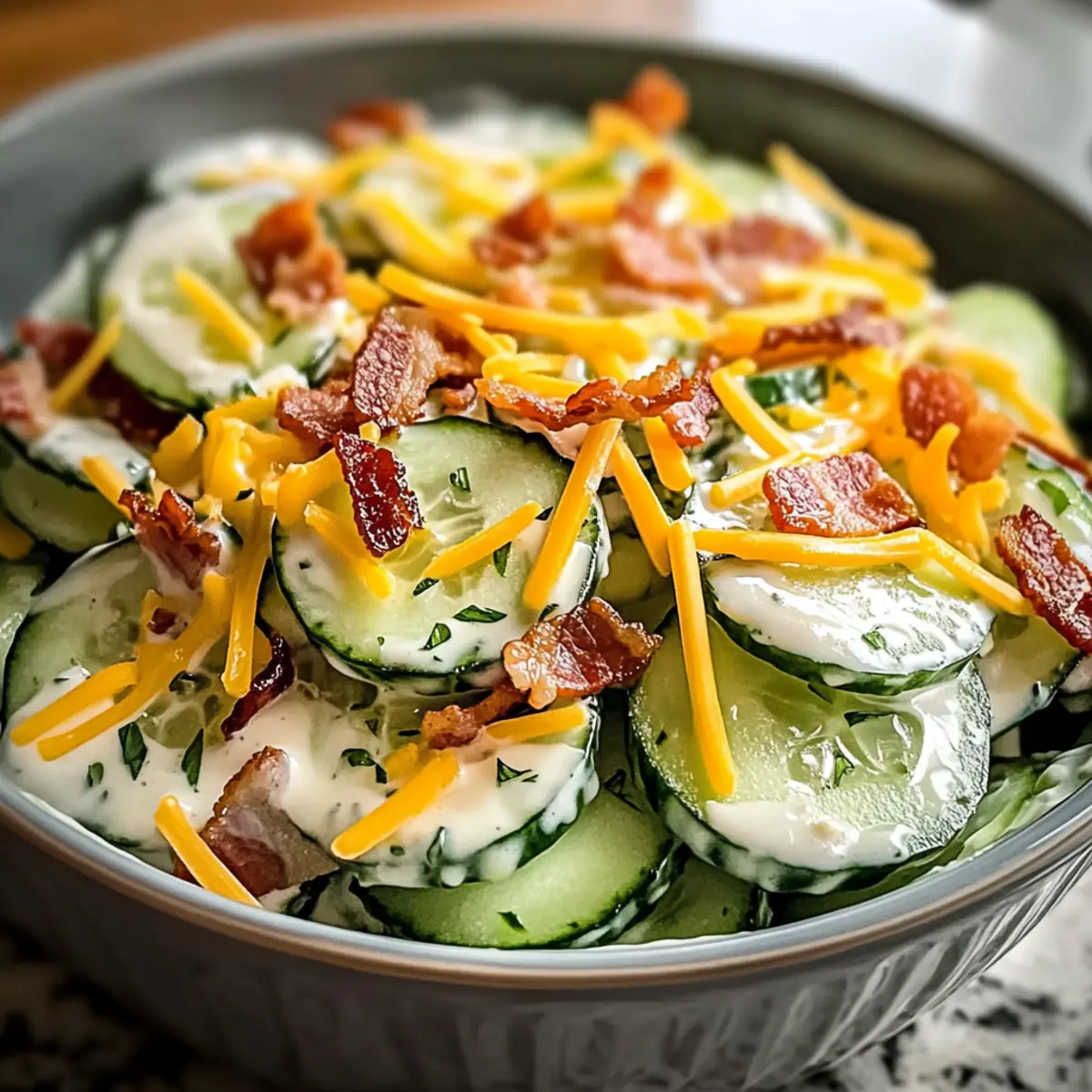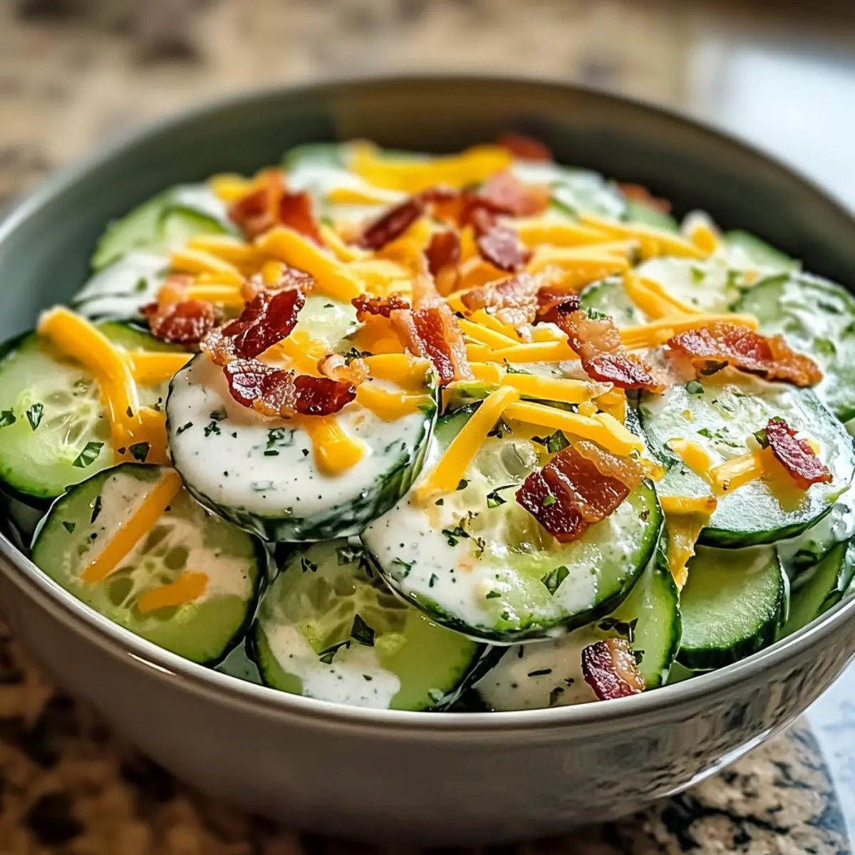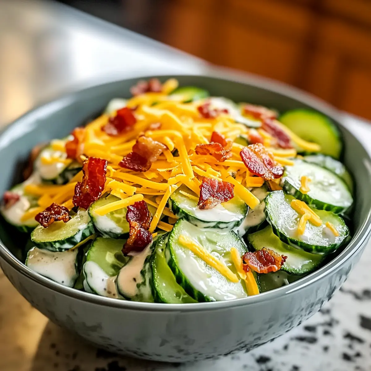 Streue den geriebenen Cheddar-Käse und die gebratenen Speckstückchen über den Salat. Du kannst die Zutaten sanft unterheben oder sie als hübsches Topping on top lassen. Achte darauf, dass du die Mischung nicht zu stark rührst, damit die Gurken ihre Form behalten.