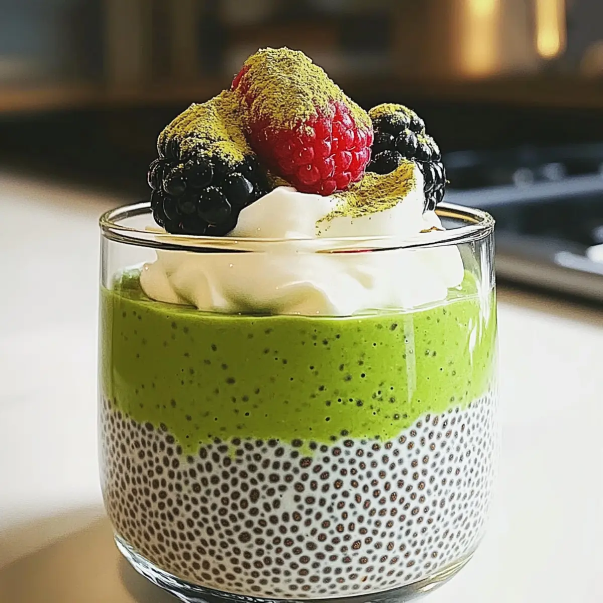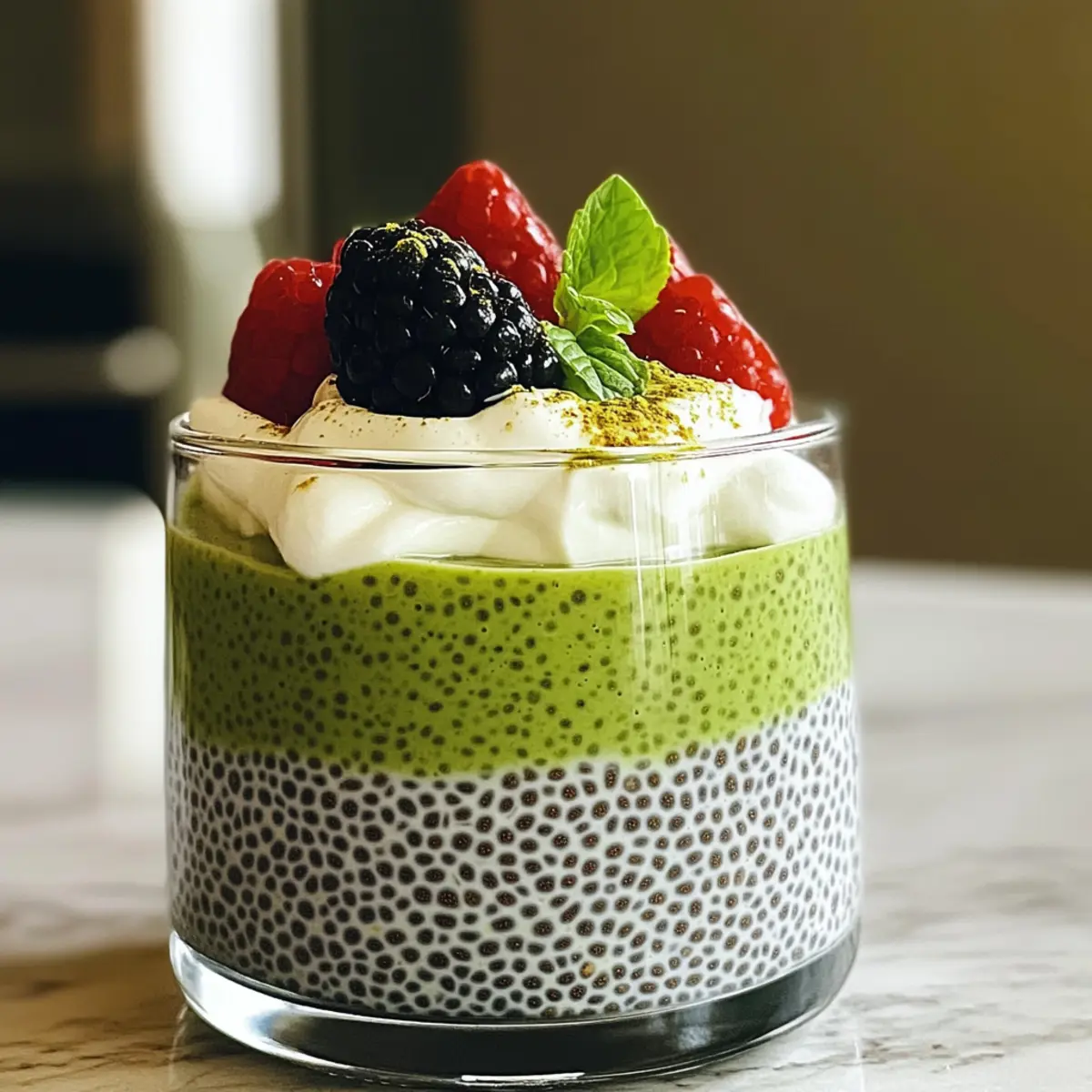 Die cremige Mischung gleichmäßig in Serviergläser oder Schalen schichten. Garniere jeden Pudding mit einem Löffel griechischem Joghurt und einem Hauch Matcha-Pulver, um das dekorative Element zu betonen. Serviere den Pudding gekühlt, idealerweise mit frischen Beeren, knusprigem Granola oder Bananenscheiben für zusätzlichen Geschmack und Textur.