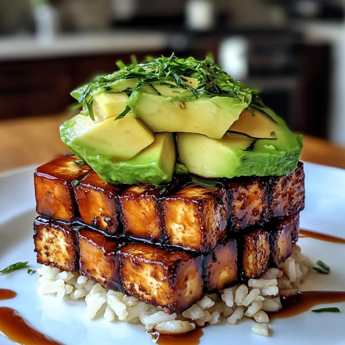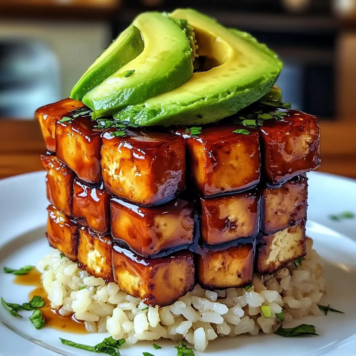 Crispy Teriyaki Tofu und Avocado-Reis-Stapel genießen