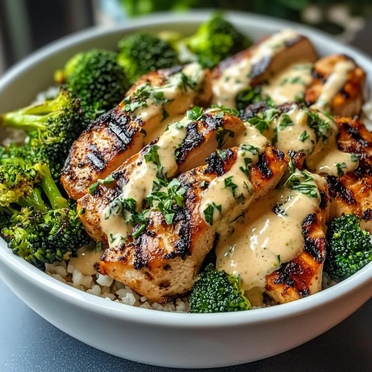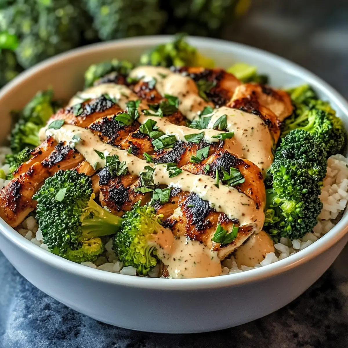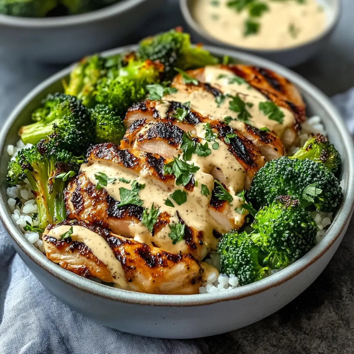 Nehmen Sie eine Schüssel und beginnen Sie mit einer Schicht Ihrer gewählten Körner, gefolgt von den in Scheiben geschnittenen gegrillten Hähnchen und den gerösteten Brokkoliröschen. Gießen Sie die cremige Knoblauchsauce großzügig über die Schalen. Garnieren Sie das Gericht nach Belieben mit frischen Kräutern wie Petersilie oder Schnittlauch für einen frischeren Geschmack.