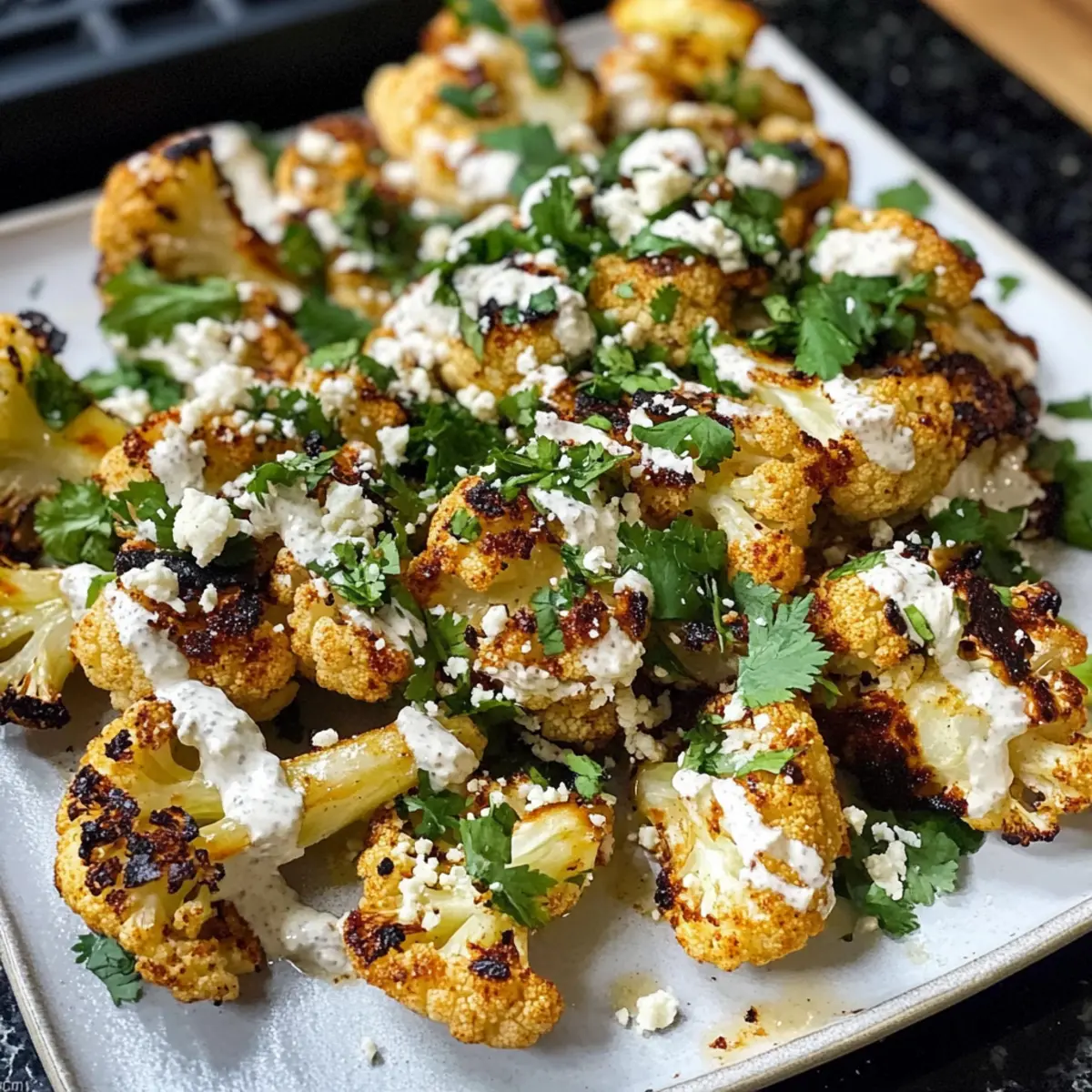 - Den fertigen Blumenkohl anrichten und mit der Knoblauchsauce, Cotija-Käse und Koriander garnieren.