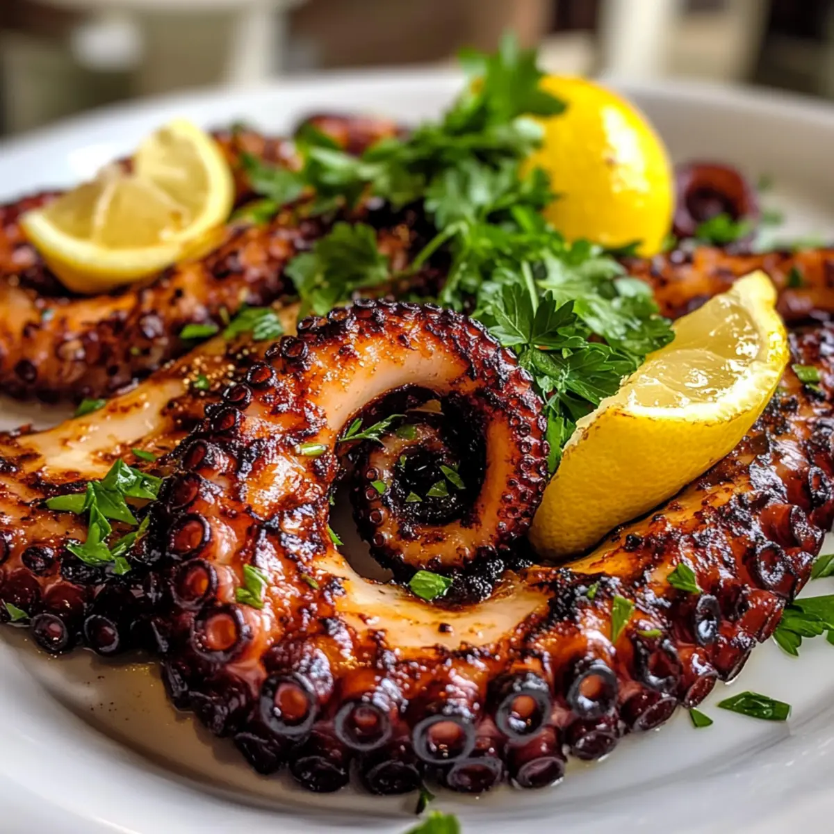 Nimm den Oktopus vom Grill und lasse ihn kurz ruhen. Schneide ihn dann in Portionen und richte ihn auf einer großen Platte an. Garniere das Gericht mit frischen Zitronenspalten und bestreue es nach Belieben mit gehackter Petersilie. Sofort servieren und die mediterranen Aromen genießen!