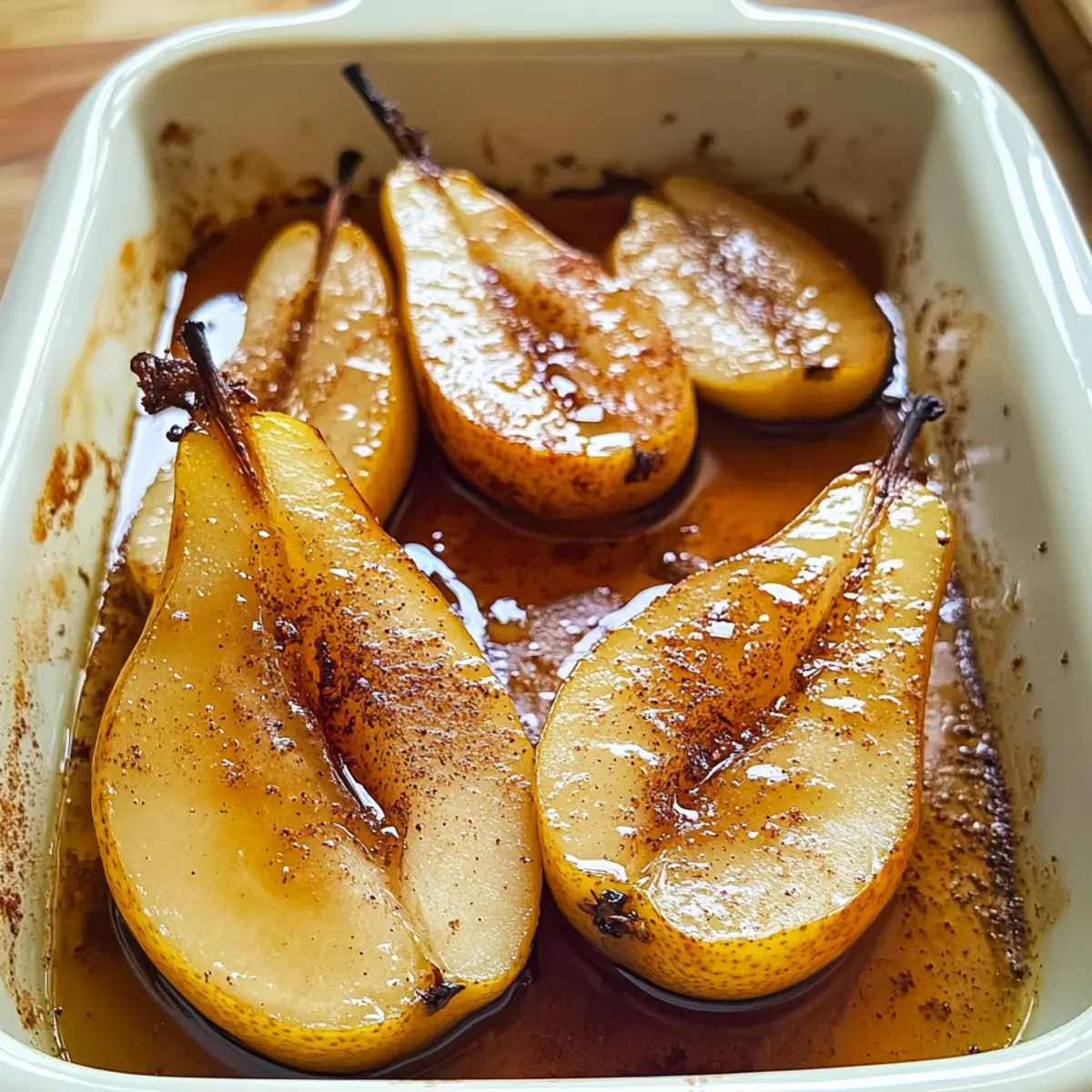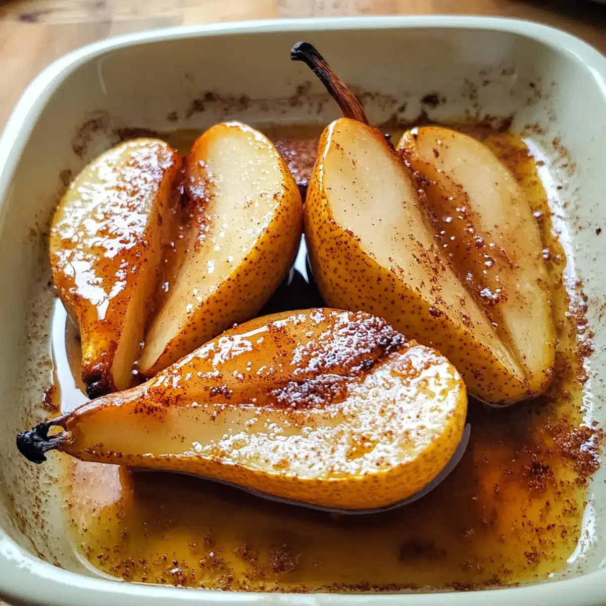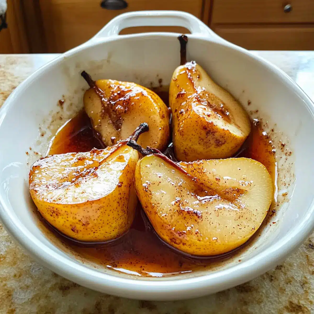Schiebe die Auflaufform in den vorgeheizten Ofen und röste die Birnen etwa 30 Minuten lang. Achte darauf, die Birnen alle 10 Minuten mit der Flüssigkeit aus der Form zu begießen. Sie sollten goldbraun und zart sein, wenn du sie herausnimmst, und die Aromen werden deinen Raum erfüllen.