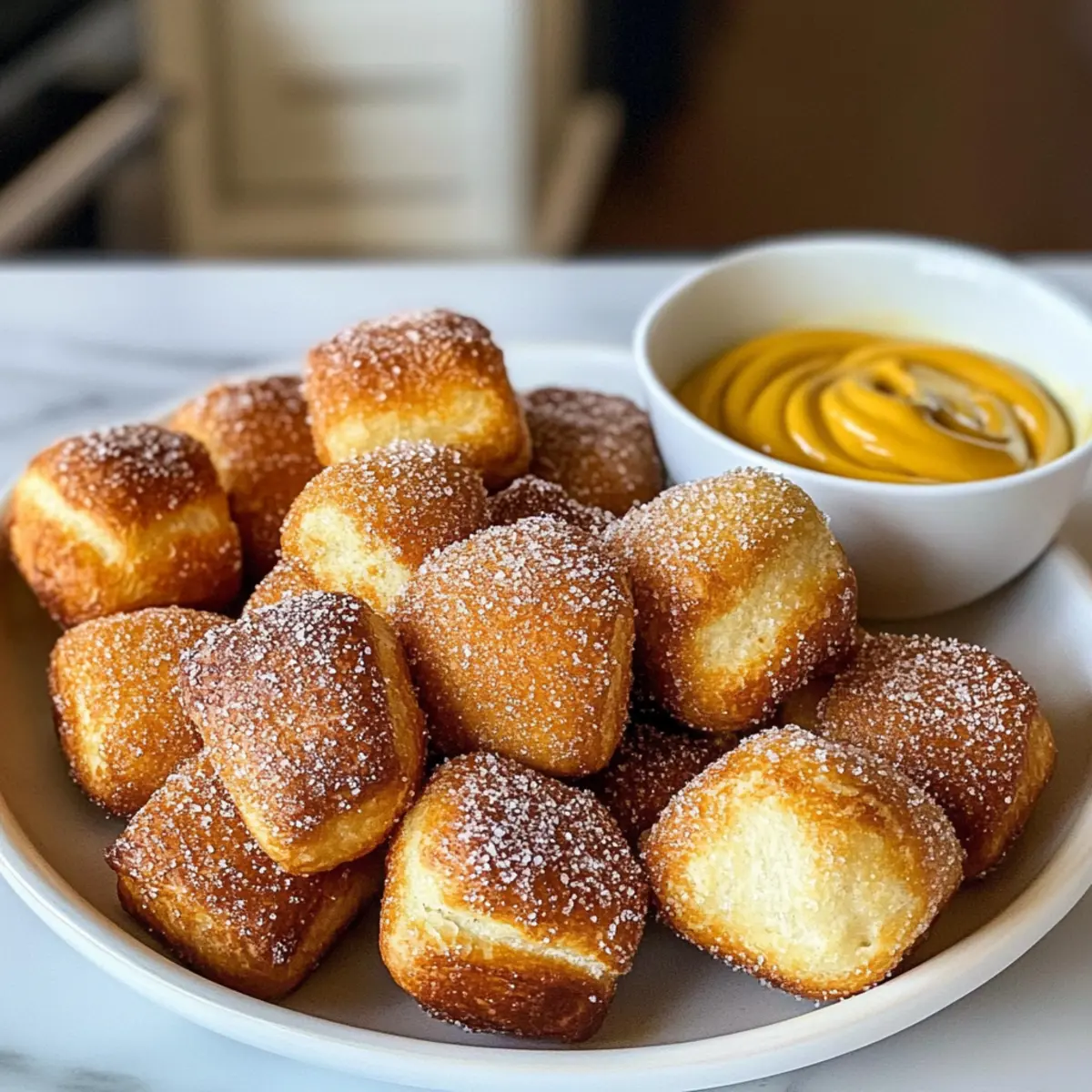 - Zimt-Zucker-Bissen zubereiten: Mischen Sie Zucker und Zimt, tauchen Sie die Brezelbissen in geschmolzene Butter und rollen Sie sie in der Mischung.