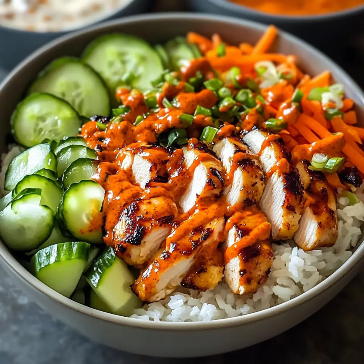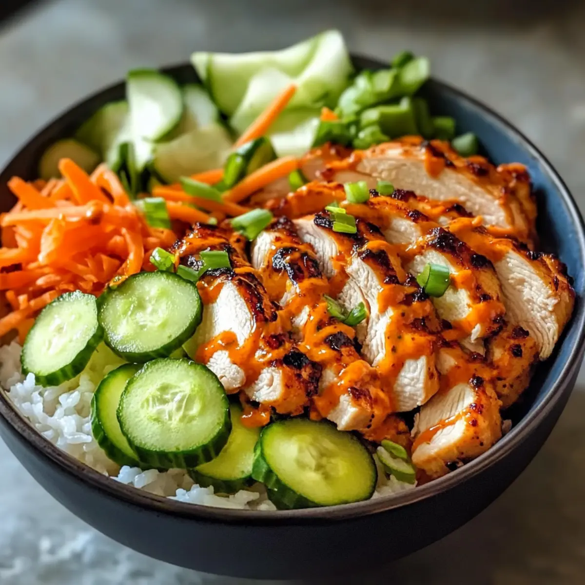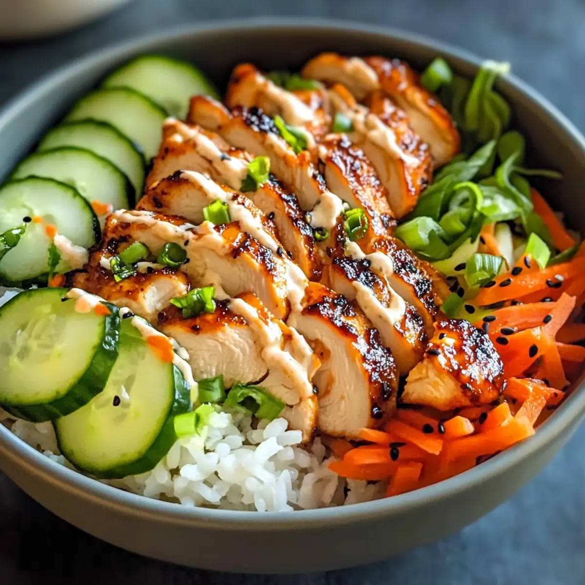 - Richte die Bowl mit einer Schicht Reis, geschnittenem Hähnchen und Gemüse an. Drizzle die cremige Soße darüber und garniere mit Frühlingszwiebeln.