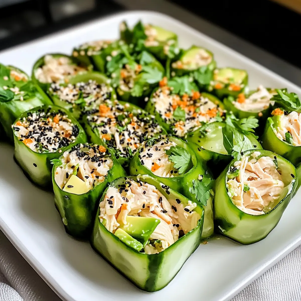 Dekoriere die Röllchen nach Belieben mit einem Hauch von Everything-Bagel-Gewürz und etwas scharfer Soße, bevor du sie servierst. Diese hellen Hähnchen-Salat Gurken-Röllchen sind perfekt für jeden Anlass und bringen Frische auf deinen Tisch!