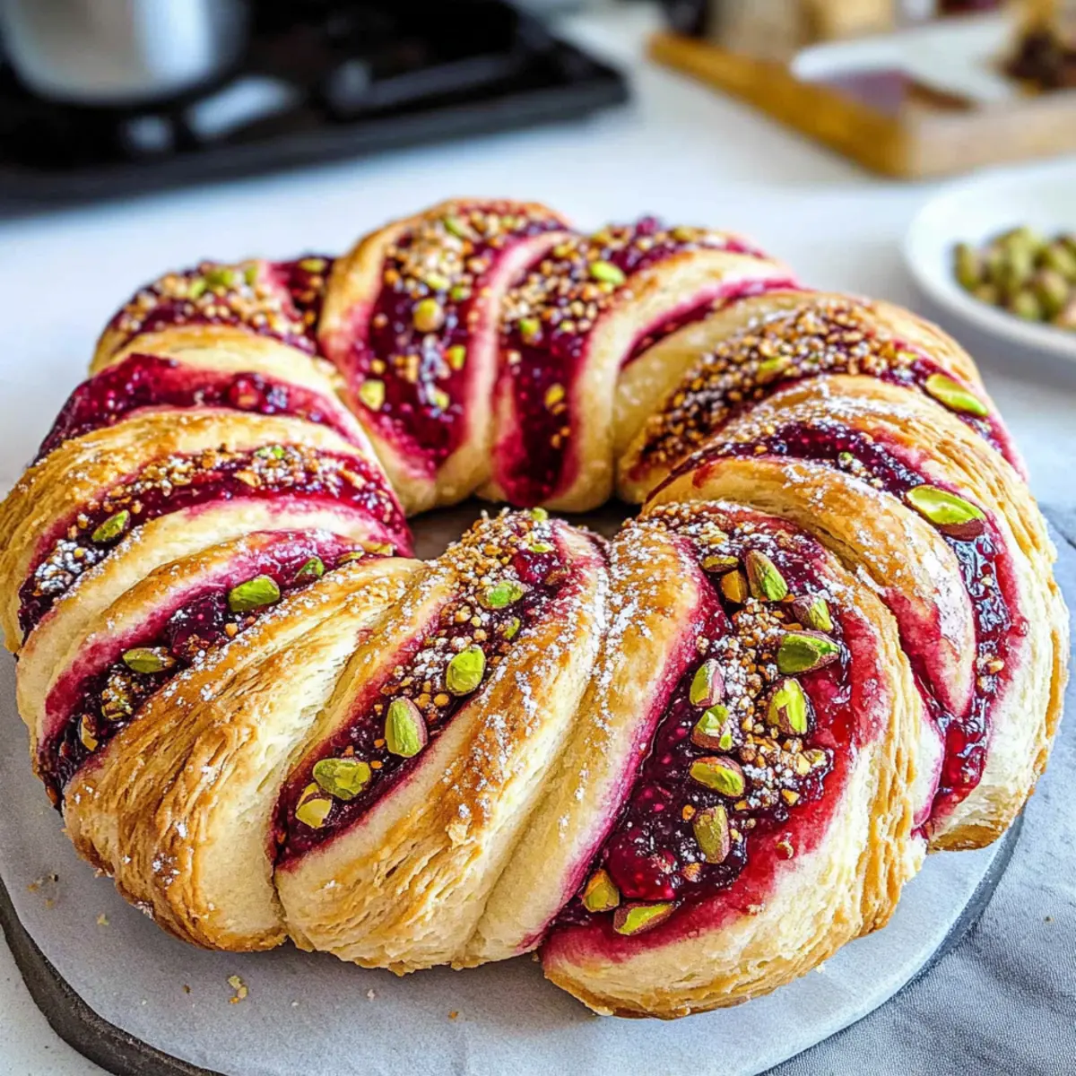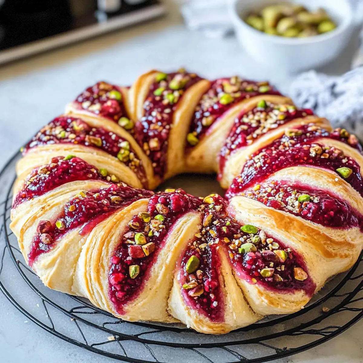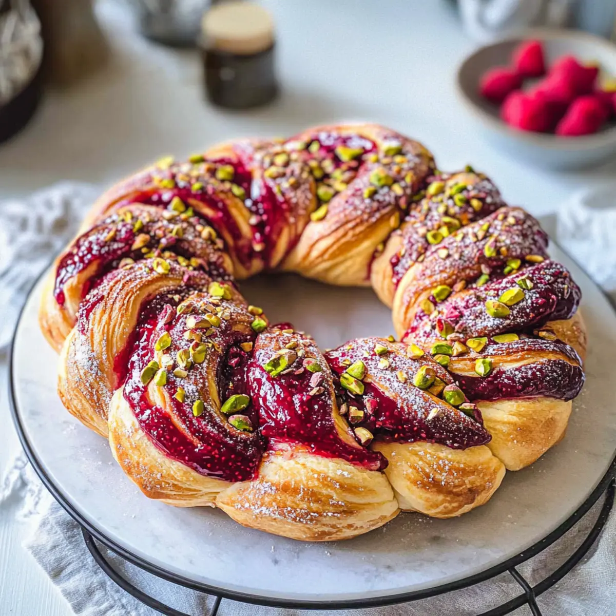 Dieser Himbeer- und Pistazienkranz ist die perfekte Wahl für deine festlichen Zusammenkünfte!