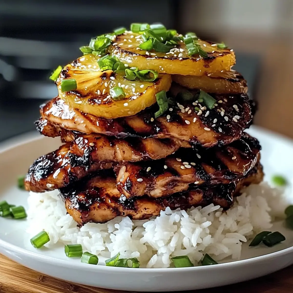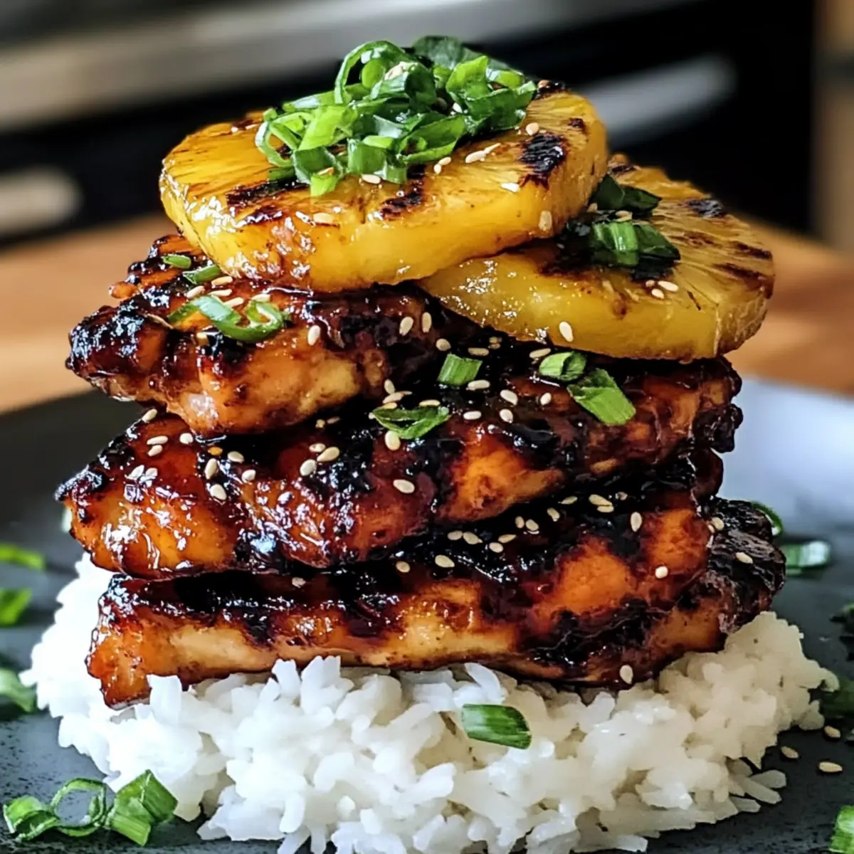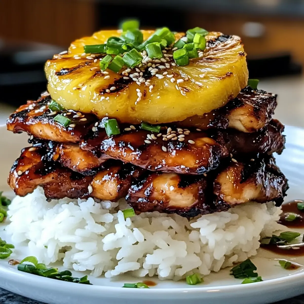 - Stapel zusammenstellen: Serviere gekochten weißen Reis auf einem Teller als Basis. Lege das gegrillte Hühnchen darauf und toppe es mit den gegrillten Ananasscheiben. Träufle die vorbereitete Glasur über das gesamte Gericht und garniere mit geschnittenen Frühlingszwiebeln und Sesamsamen.