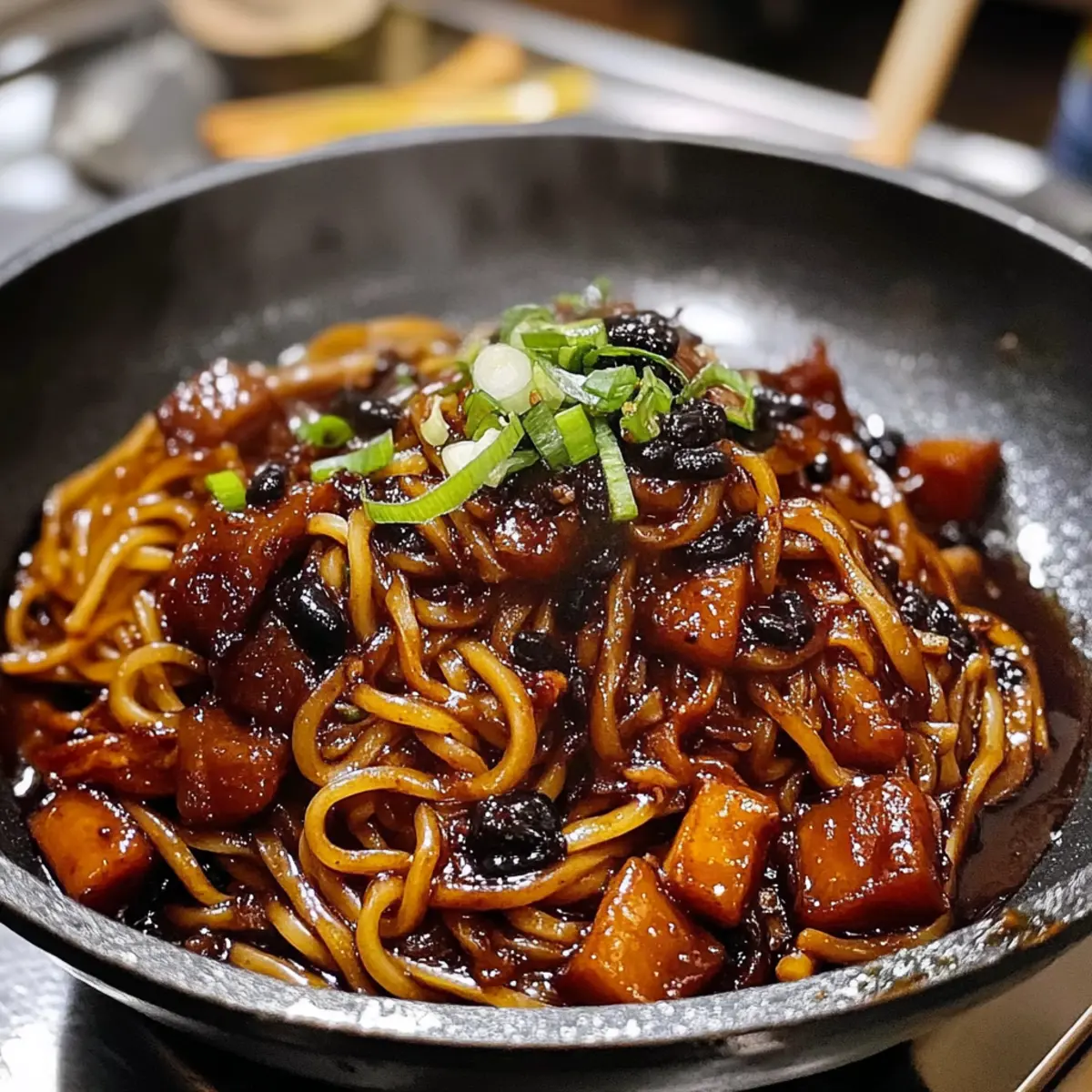 - Korean Black Bean Paste (Chunjang) – das Herzstück dieses Gerichts; andere Bohnensaucen können verwendet werden, verändern jedoch den Geschmack.