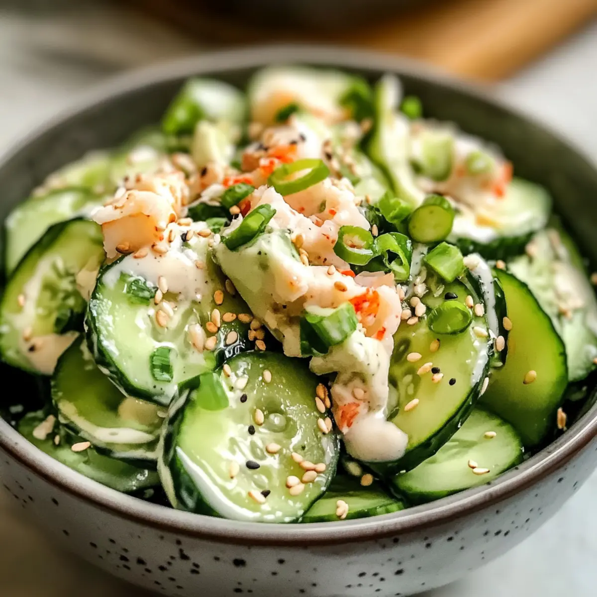 Gieße das vorbereitete Dressing über die Gurkenmischung. Nutze eine große Gabel oder einen Löffel, um alles sanft zu vermengen, bis das Dressing gleichmäßig verteilt ist. Achte darauf, dass alle Zutaten gut miteinander kombiniert sind, damit jede Gabel den köstlichen Geschmack des Kalifornische Rolle Gurkensalats einfängt.