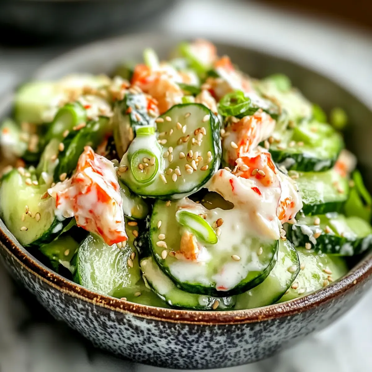 Der Kalifornische Rolle Gurkensalat kann sofort genossen werden. Wenn du möchtest, lasse ihn vor dem Servieren noch kurz im Kühlschrank durchziehen, um die Aromen zu intensivieren. Garniere ihn nach Belieben mit zusätzlichen Sesamkörnern für einen knackigen Abschluss. Bereite dich darauf vor, diesen erfrischenden Salat auf den Tisch zu bringen!