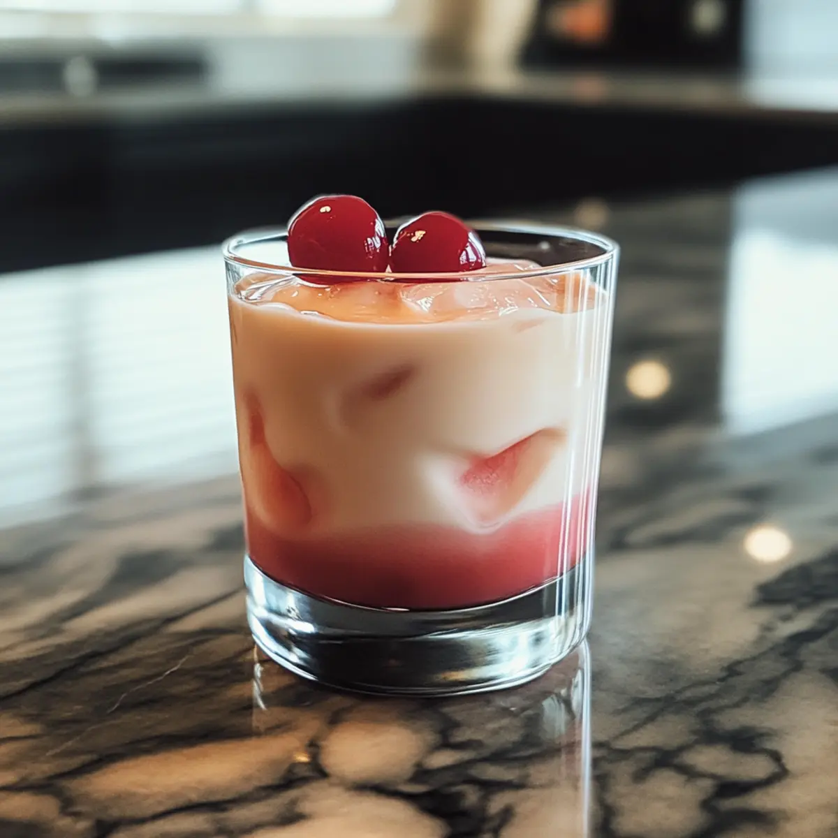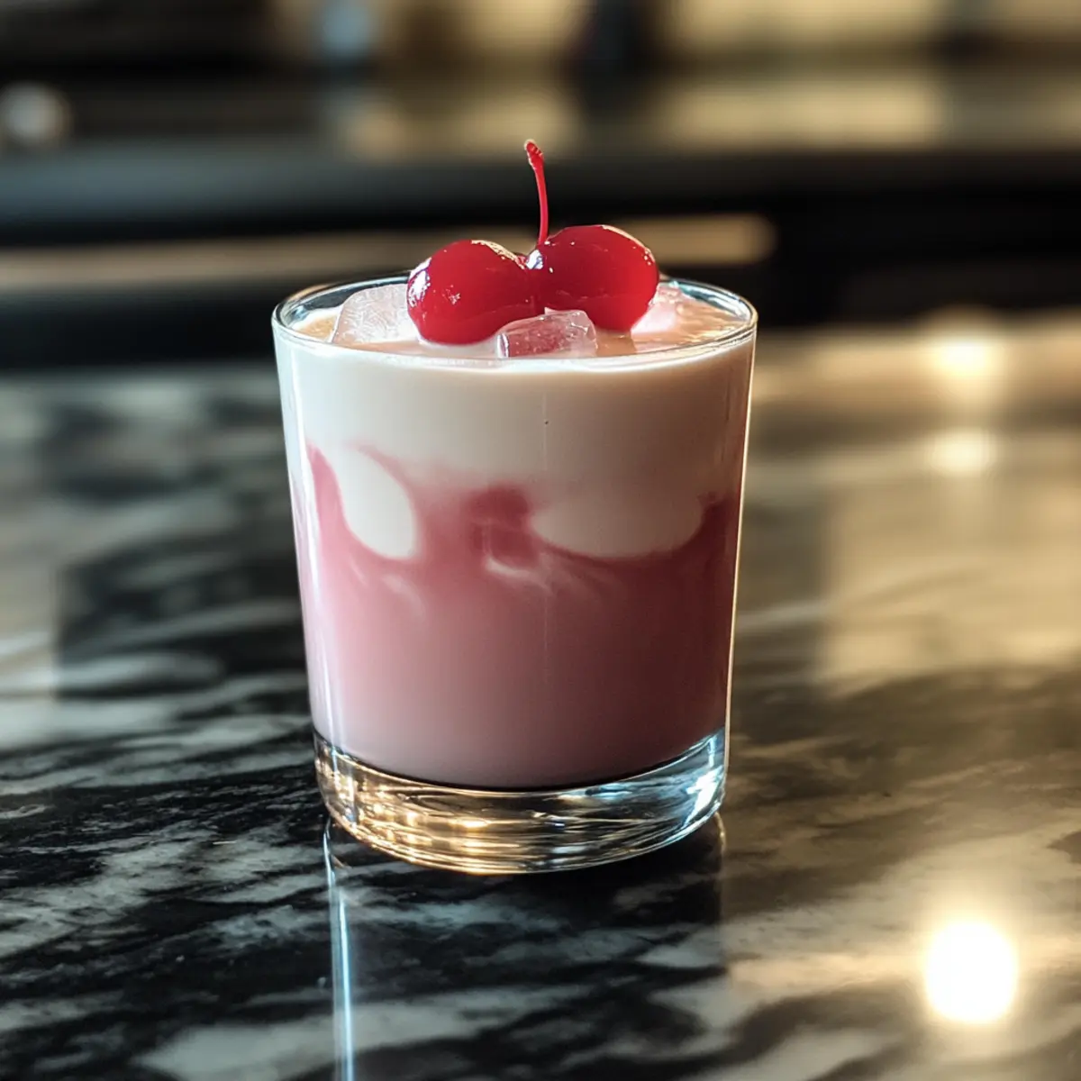 - Setze zwei Maraschino-Kirschen als Garnitur auf die Oberseite des Cocktails.