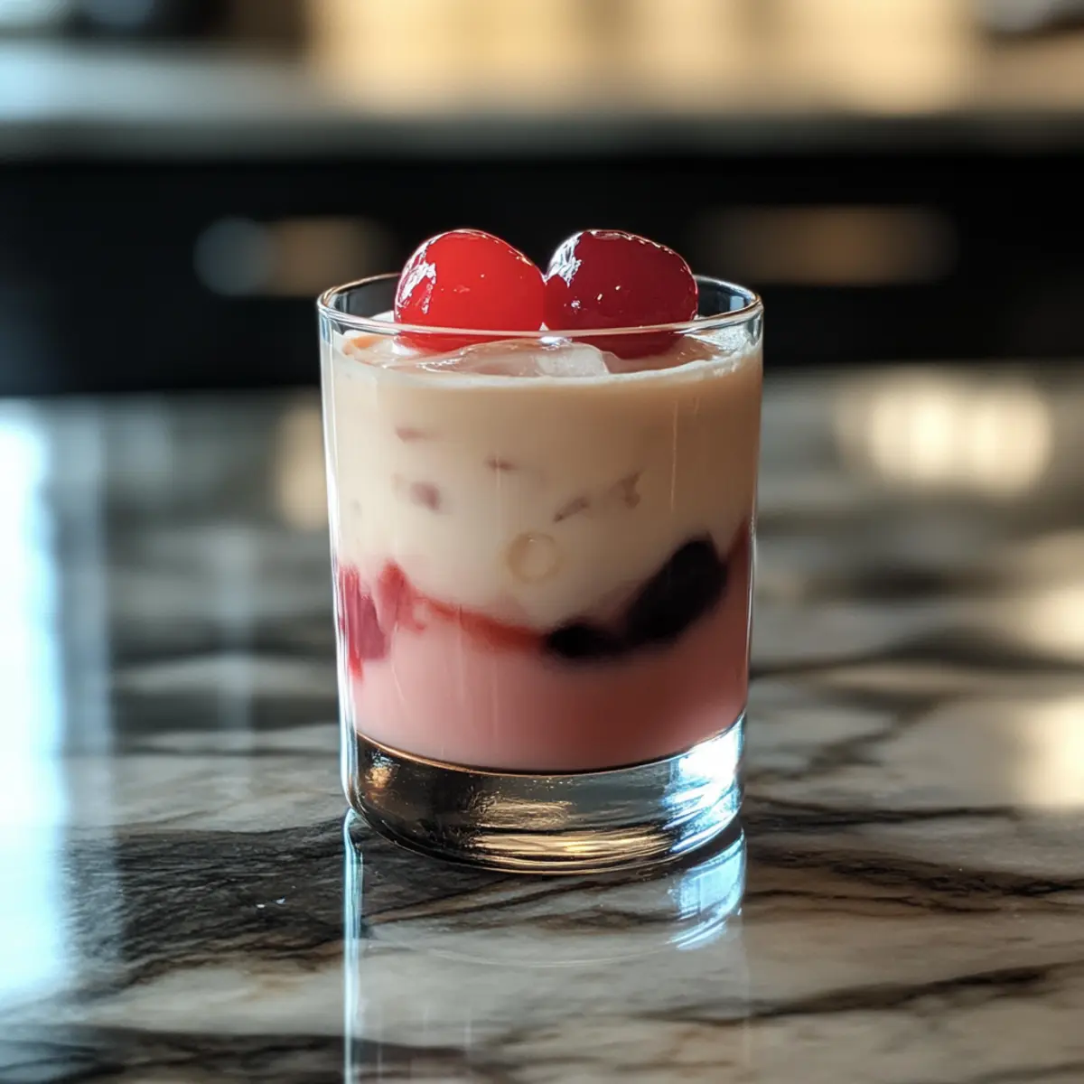 Setze zwei Maraschino-Kirschen als Garnitur auf die Oberseite des Cocktails. Sie bringen einen farbenfrohen Akzent und verleihen der Kirschen-Rosen-Schlammlawine einen festlichen Touch. Achte darauf, dass die Kirschen stabil auf der cremigen Oberfläche liegen.