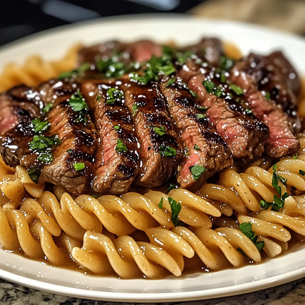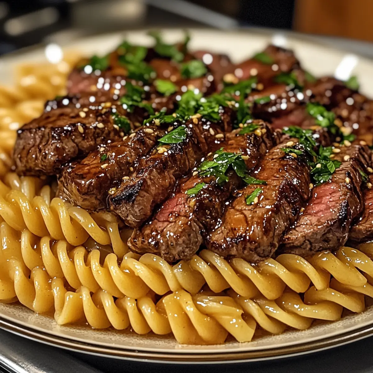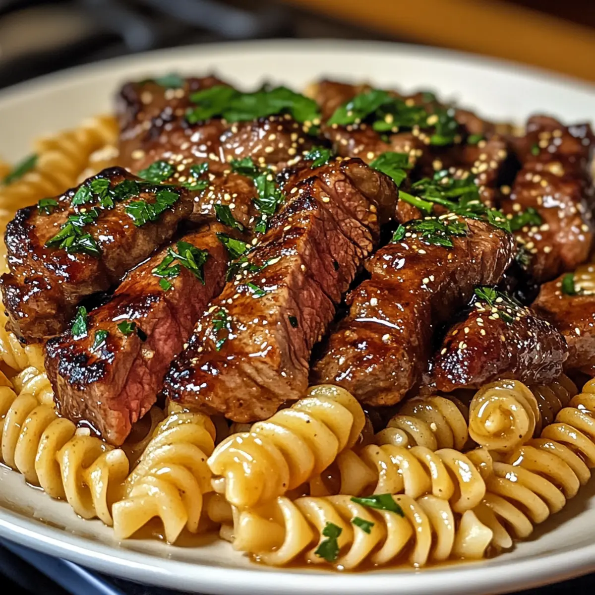 - Richte das klebrige Honig-Knoblauch-Rindersteak über den Rotini an und garniere es mit frischer, gehackter Petersilie. Serviere das Gericht sofort.