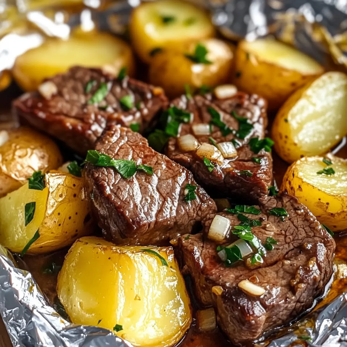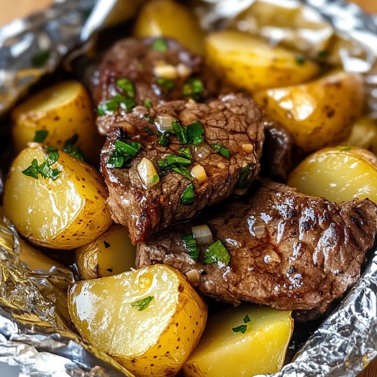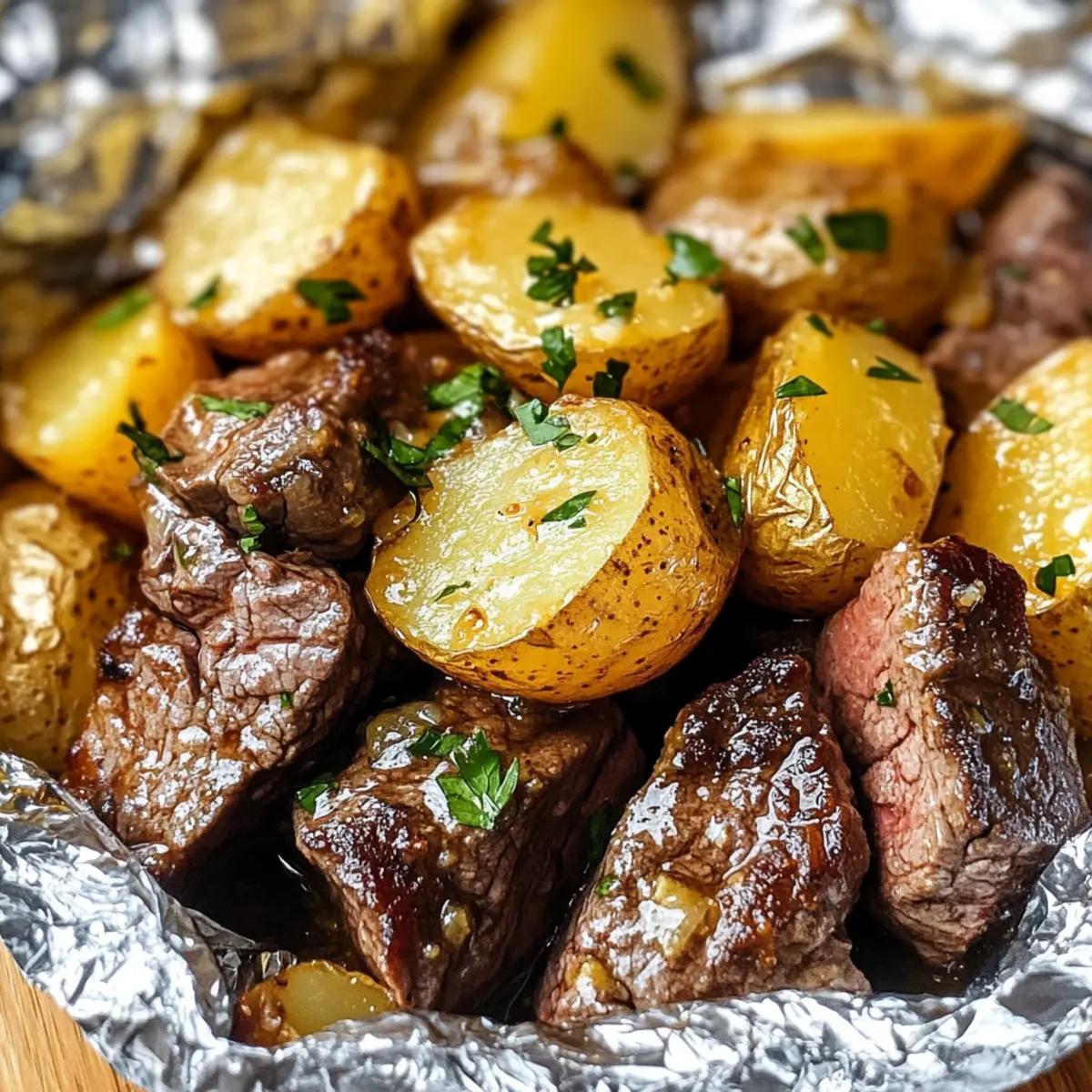 Legen Sie ein großes Stück Aluminiumfolie auf eine Arbeitsfläche und geben Sie die Steak-Kartoffel-Mischung in die Mitte. Falten Sie die Folie vorsichtig zusammen, um ein dichtes Päckchen zu formen. Dies hilft dabei, den Dampf zu halten und die Aromen des Knoblauchbuttersteaks gleichmäßig zu verteilen.