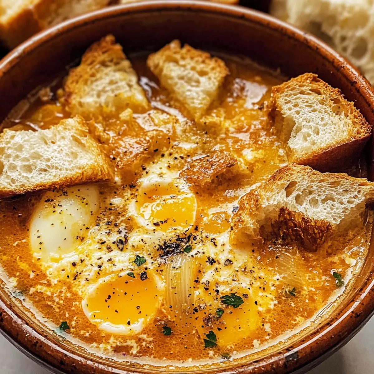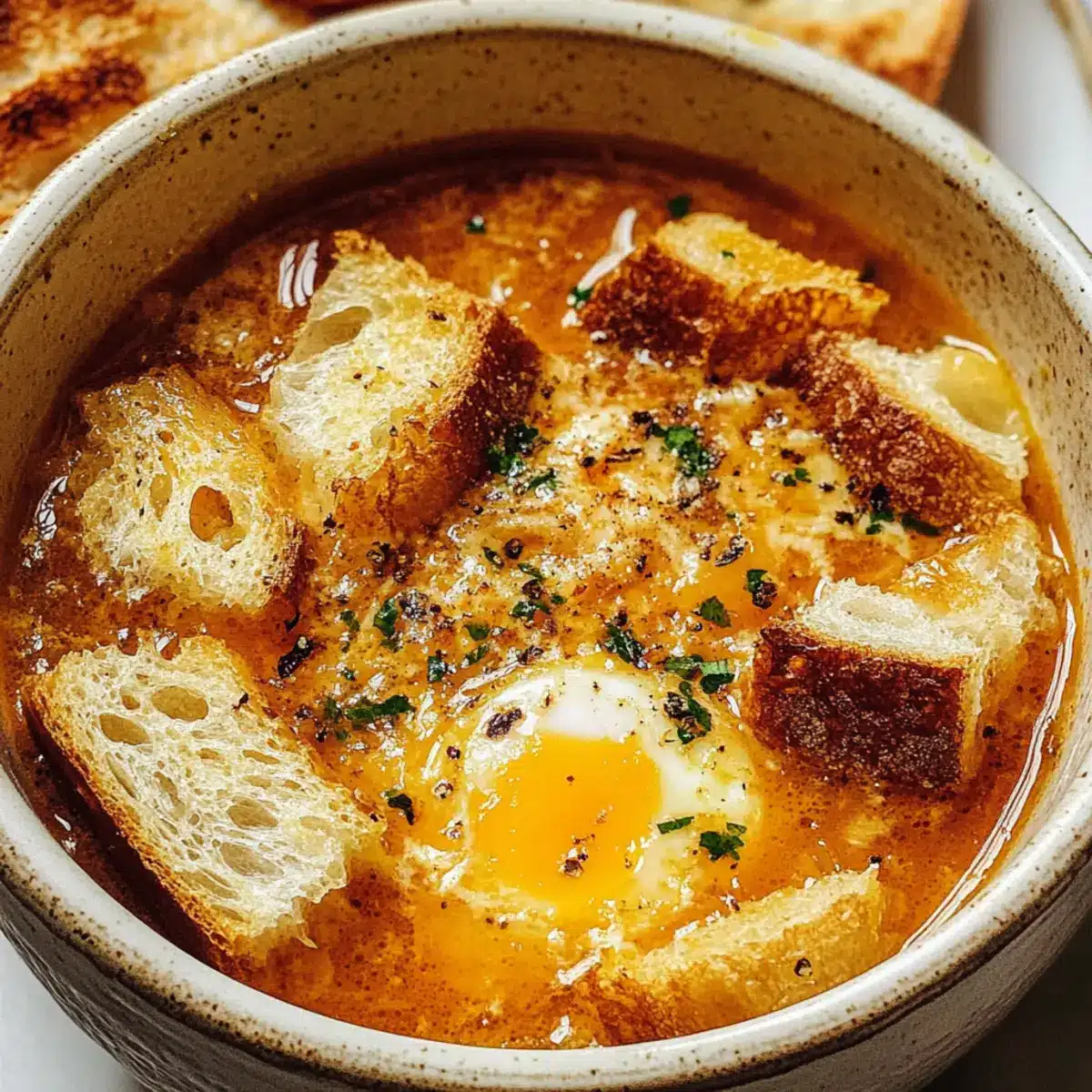 Erlebe die harmonischen Geschmäcker, die deine Geschmacksknospen erfreuen und diese warme Umarmung der Knoblauchsuppe vollenden.