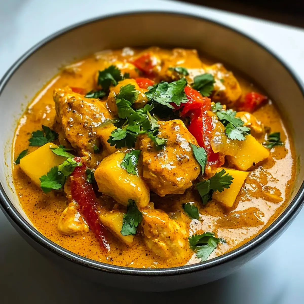 Einzigartiger Genuss: Dieses Mango-Hühnchen-Curry vereint süße Mangos mit herzhaftem Hühnchen und einer cremigen Kokosmilchsoße – ein Geschmack, der verführt!