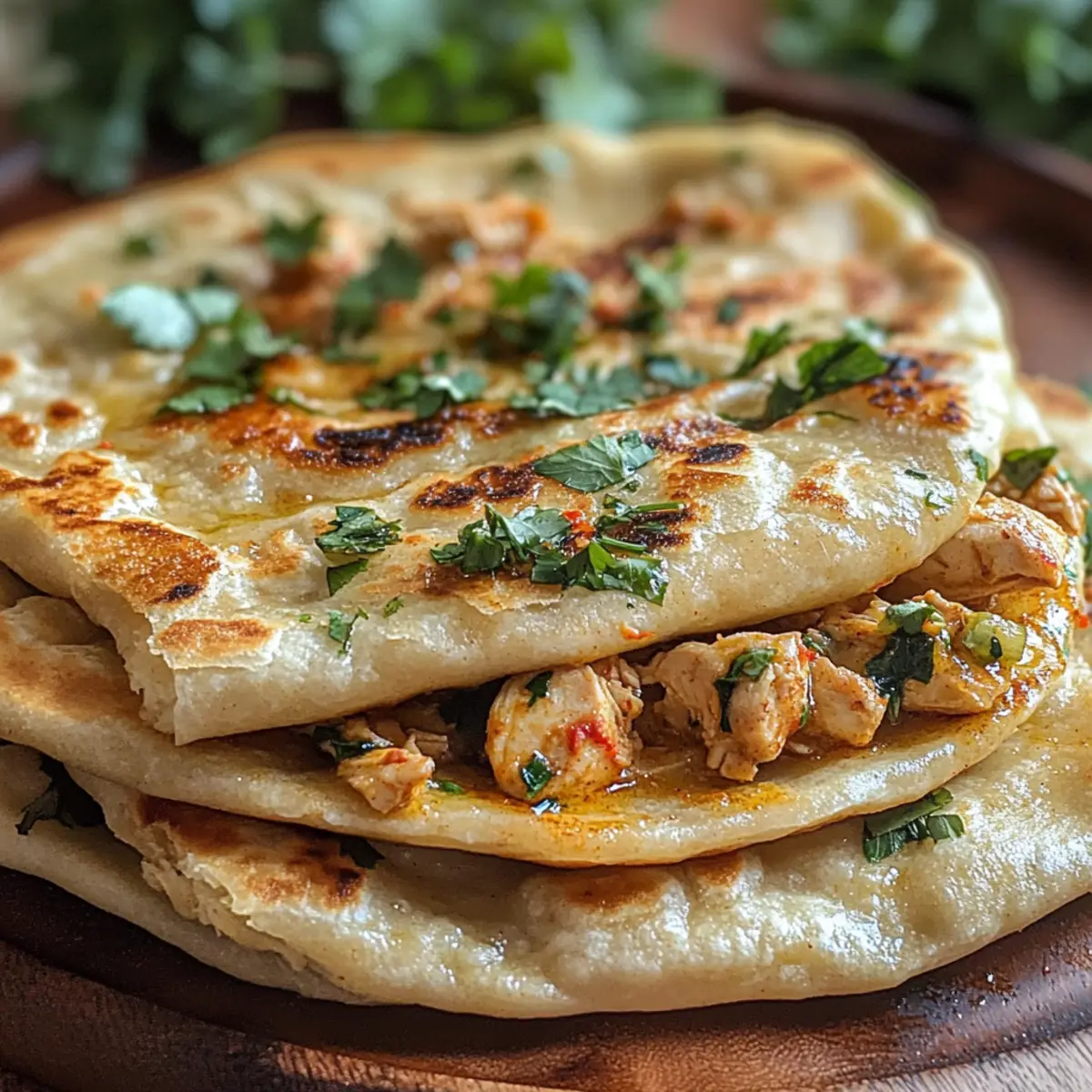 Teilen Sie den ruhenden Teig in gleichmäßige Portionen, etwa tennisballgroß. Rollen Sie jede Portion auf einer leicht bemehlten Oberfläche dünn aus. Bestreichen Sie die Oberseite mit etwas geschmolzener Butter und falten Sie den Teig in Schichten, um einen luftigen, flauschigen Fladen zu erhalten.