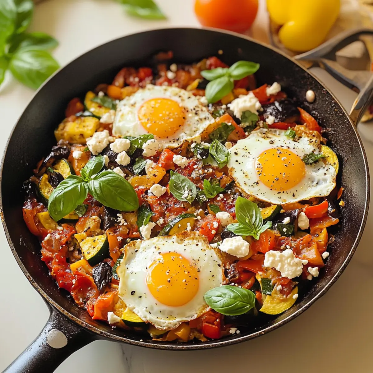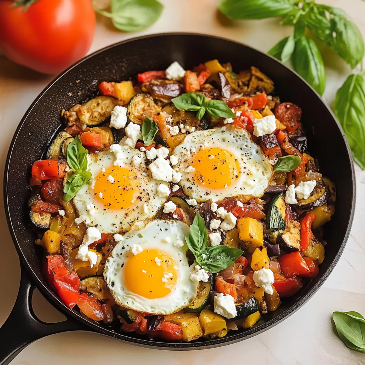Vielfalt der Aromen: Diese Mediterrane Frühstückspfanne kombiniert verschiedene Gemüsesorten, die jedem Bissen eine neue Geschmackstiefe verleihen.
