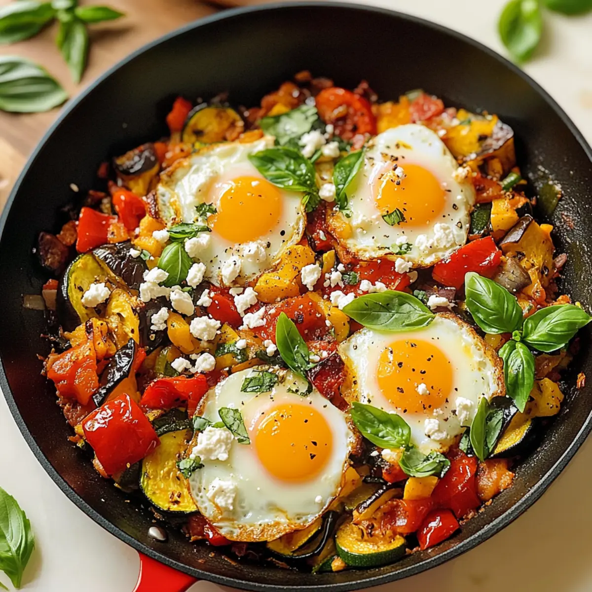 Nehmen Sie die Pfanne vom Herd und streuen Sie 100 g zerbröckelten Feta-Käse und frische, gehackte Basilikumblätter darüber. Lassen Sie die Farben und Aromen der Mediterranen Frühstückspfanne miteinander strahlen und servieren Sie sie direkt aus der Pfanne. Genießen Sie dieses nahrhafte Frühstück mit knusprigem Brot!