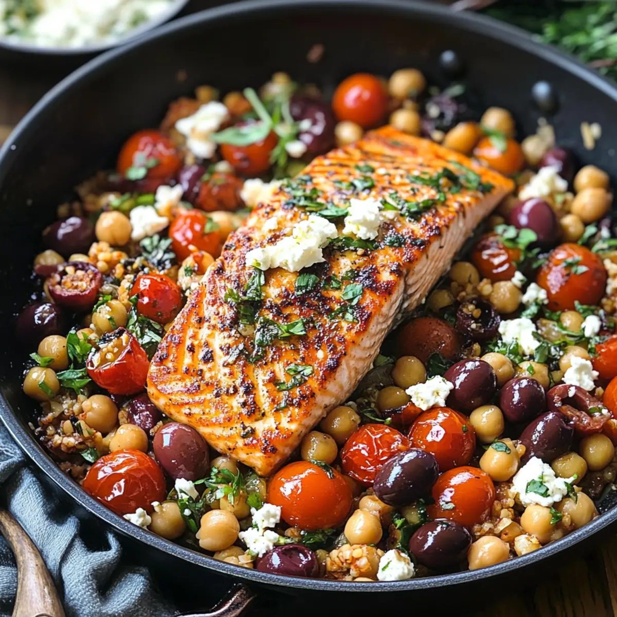 Reichhaltiger Geschmack: Die Kombination aus Lachs, Kichererbsen, Feta und frischem Gemüse sorgt für ein Geschmacksabenteuer, das deine Geschmacksknospen wecken wird.