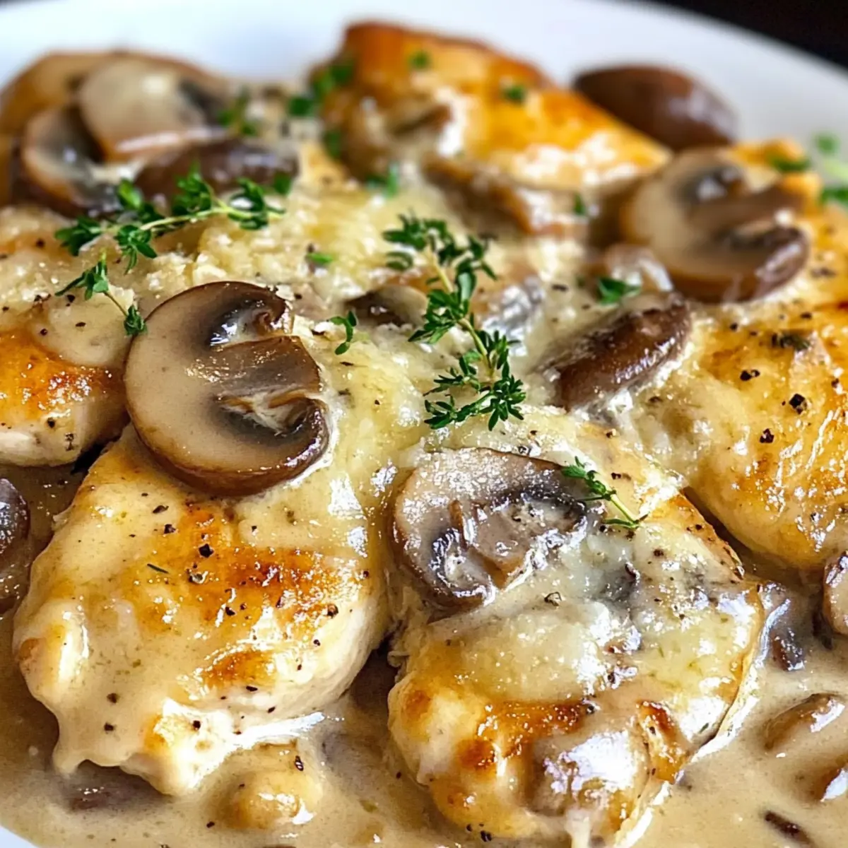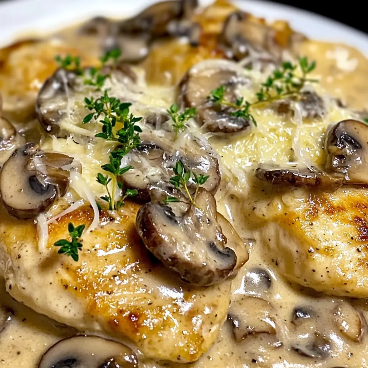 Das Hühnchen wieder in die Pfanne zurückgeben und auf niedriger Hitze nur kurz erwärmen. Anschließend das Pilz Asiago Hühnchen auf Tellern anrichten und nach Belieben mit frisch gehacktem Thymian garnieren. Servieren Sie es am besten über Pasta oder Reis, um die köstliche Sauce optimal auszunützen und genießen Sie Ihr selbstgemachtes Gourmetgericht!
