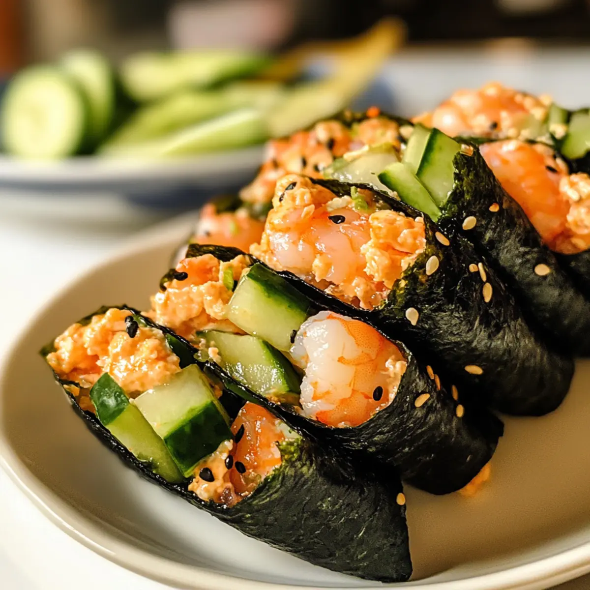 Lege die fertigen Handrolls auf einen Teller und bestreue sie mit schwarzem Sesam für eine ansprechende Optik. Serviere sie sofort, um die Knackigkeit des Nori und die Frische der Zutaten zu bewahren. Diese Scharfen Garnelen Sushi Handrolls sind perfekt für ein schnelles Abendessen oder als Teil eines Sushi-Buffets.