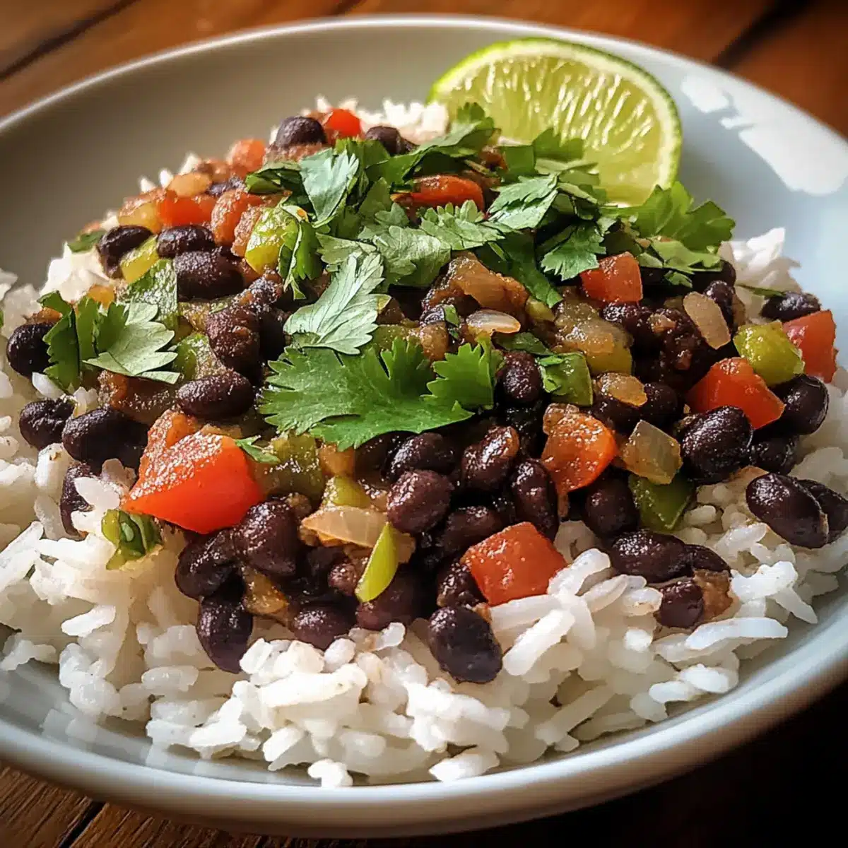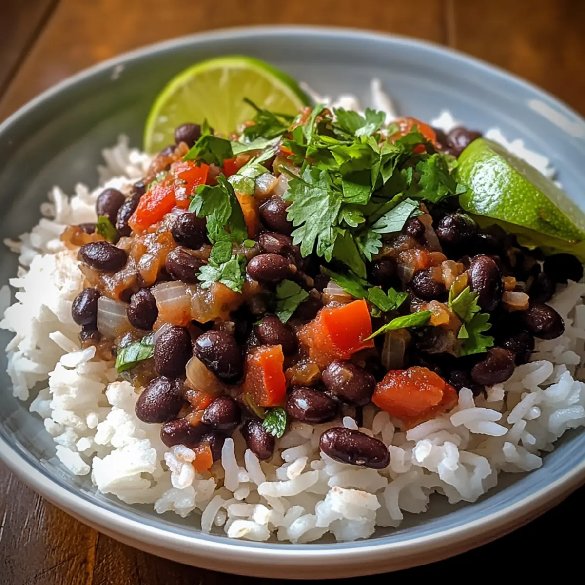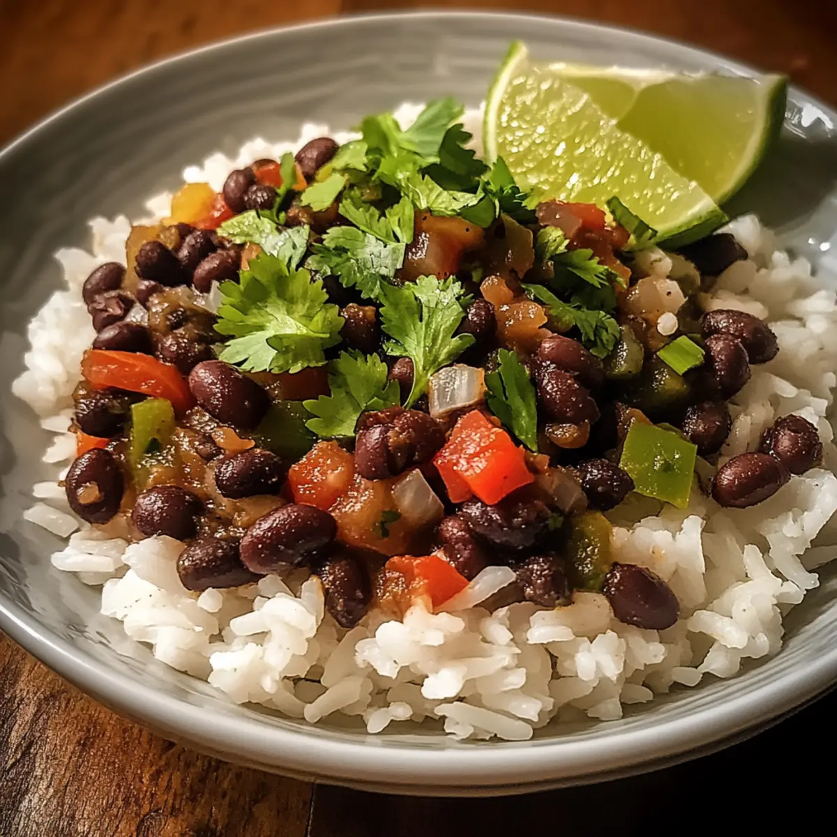 - Serviere die leckeren schwarzen Bohnen über dem fluffigen Reis und lege Limettenviertel daneben.