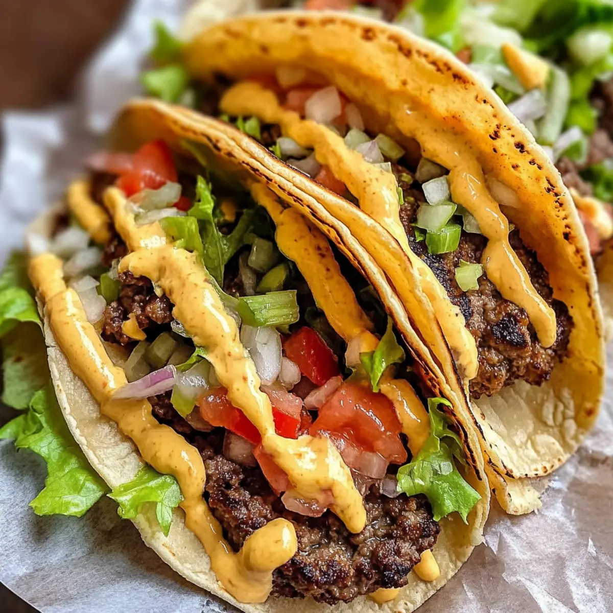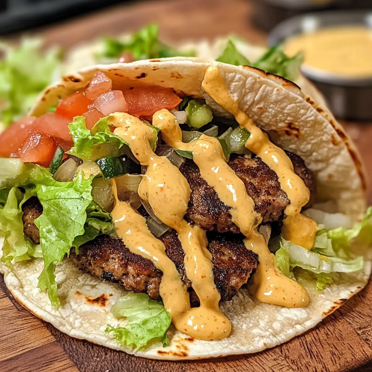 - Servieren Sie die fertigen Smash Burger Tacos heiß, zusammen mit einer weiteren Portion der hausgemachten Sauce an der Seite.
