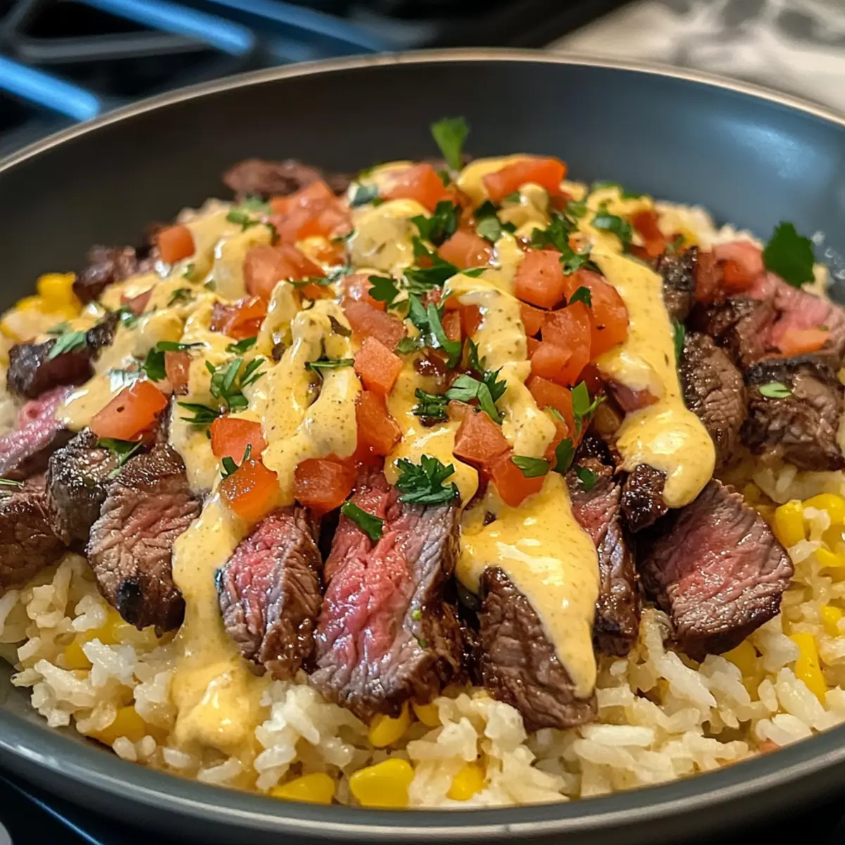 - Verteile den Reis auf Schalen, belege ihn mit Steakstreifen und träufle die Queso-Sauce darüber. Dekoriere nach Belieben.