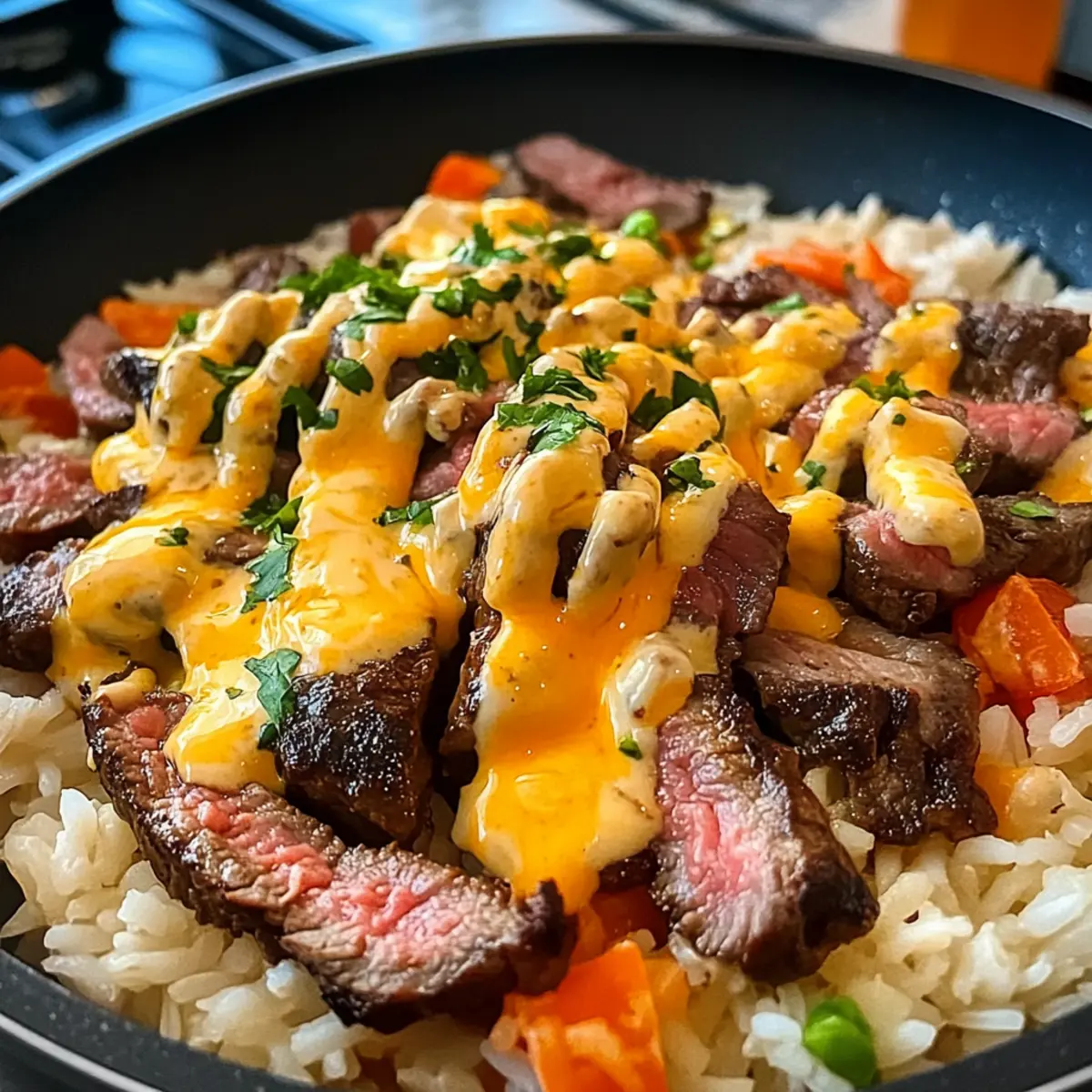 Die Zubereitung von Steak Käse Reis kann ideal auf dich und deinen hektischen Alltag abgestimmt werden! Du kannst den Reis bis zu 3 Tage im Voraus zubereiten und ihn dann in einem luftdichten Behälter im Kühlschrank aufbewahren. Auch die Steakstreifen lassen sich perfekt vorbereiten – würze sie und brate sie bis zur gewünschten Garstufe an; nach dem Abkühlen bewahre sie in einem separaten Behälter im Kühlschrank auf, um die Saftigkeit zu erhalten. Die Queso-Sauce kann ebenfalls vorab zubereitet werden; erwärme sie vorsichtig bei niedriger Hitze, um die cremige Konsistenz zu bewahren. Wenn es Zeit zum Servieren ist, erhitze einfach alle Komponenten und bringe sie zusammen, um die Aromen frisch und köstlich zu genießen – so sparst du Zeit bei der Zubereitung und kannst den Geschmack deines Steak Käse Reis auch an stressigen Abenden genießen.