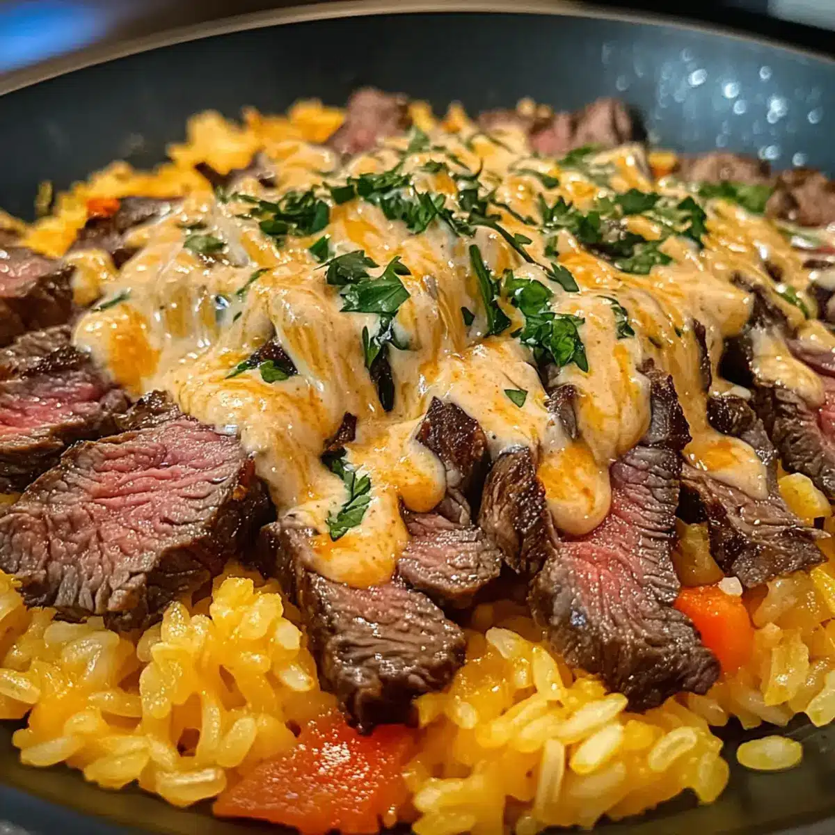 Verteile den fluffigen Reis gleichmäßig auf Schalen. Belege den Reis großzügig mit den zarten Steakstreifen und träufle die warme Queso-Sauce darüber. Dekoriere das Gericht nach Belieben mit frischem Koriander, gewürfelten Tomaten, Jalapeños oder einem Klecks saurer Sahne. Serviere das Steak Käse Reis sofort, damit die Aromen frisch und köstlich sind.