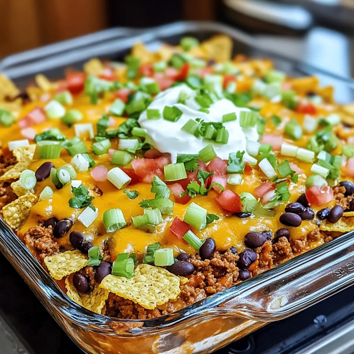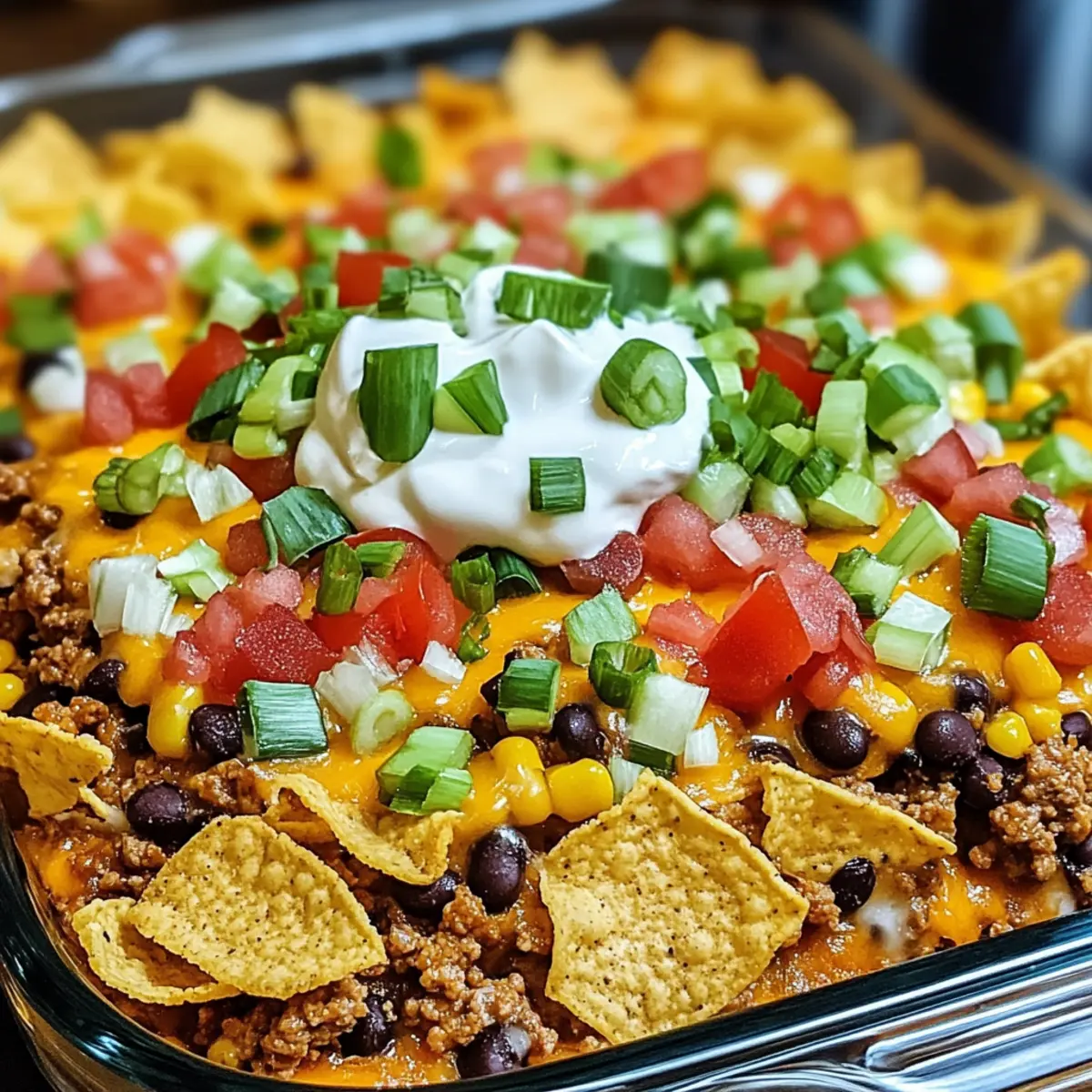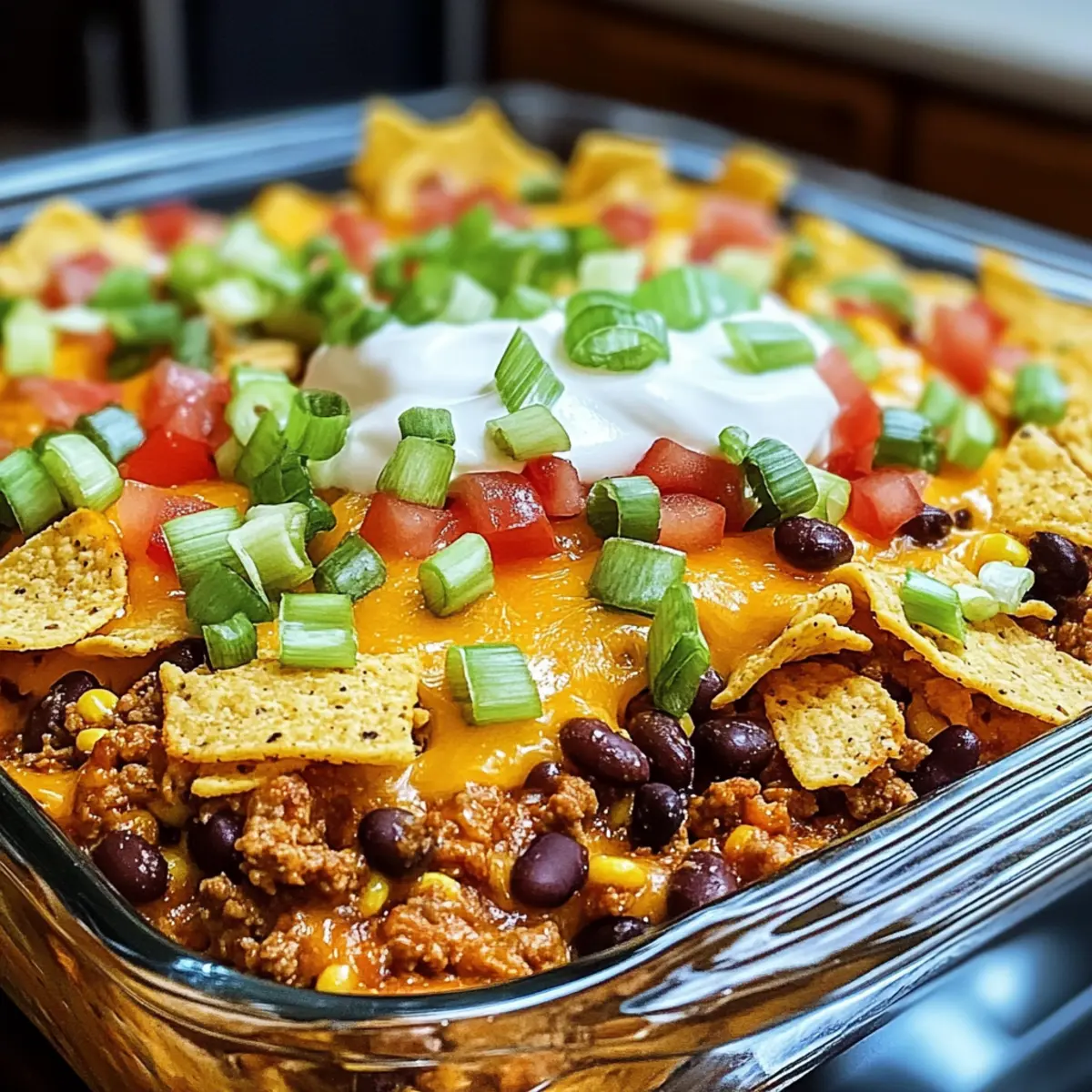 Nehmen Sie den Auflauf aus dem Ofen und garnieren Sie ihn nach Belieben mit zusätzlichen Frito Chips und frischen Toppings wie grünen Zwiebeln, Sauerrahm oder Guacamole. Diese Ergänzungen bringen nicht nur Farbe, sondern auch Geschmack auf Ihren Taco Auflauf Bake.