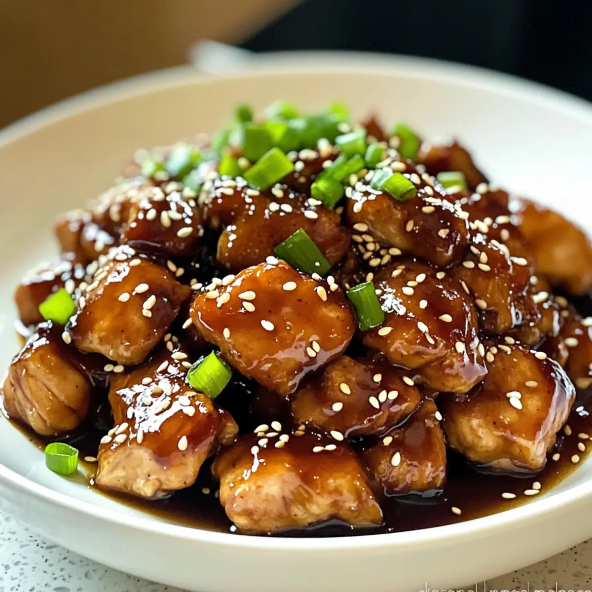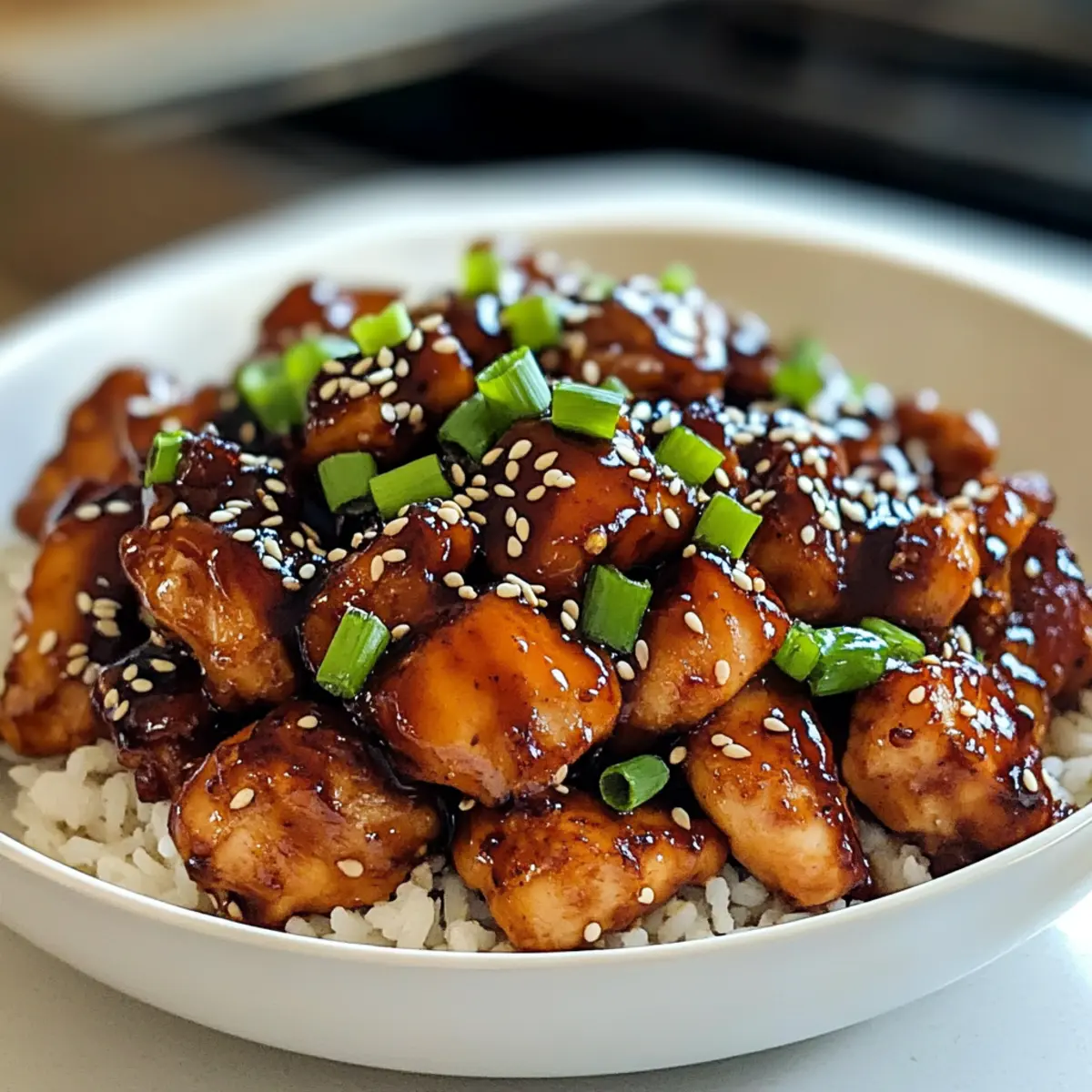Nehme die Pfanne vom Herd und garniere dein Teriyaki-Hühnchen mit Sesamsamen und gehackten Frühlingszwiebeln. Serviere es heiß über einem Bett aus gedämpftem Reis oder mit Nudeln, um die köstlichen Aromen perfekt zur Geltung zu bringen.