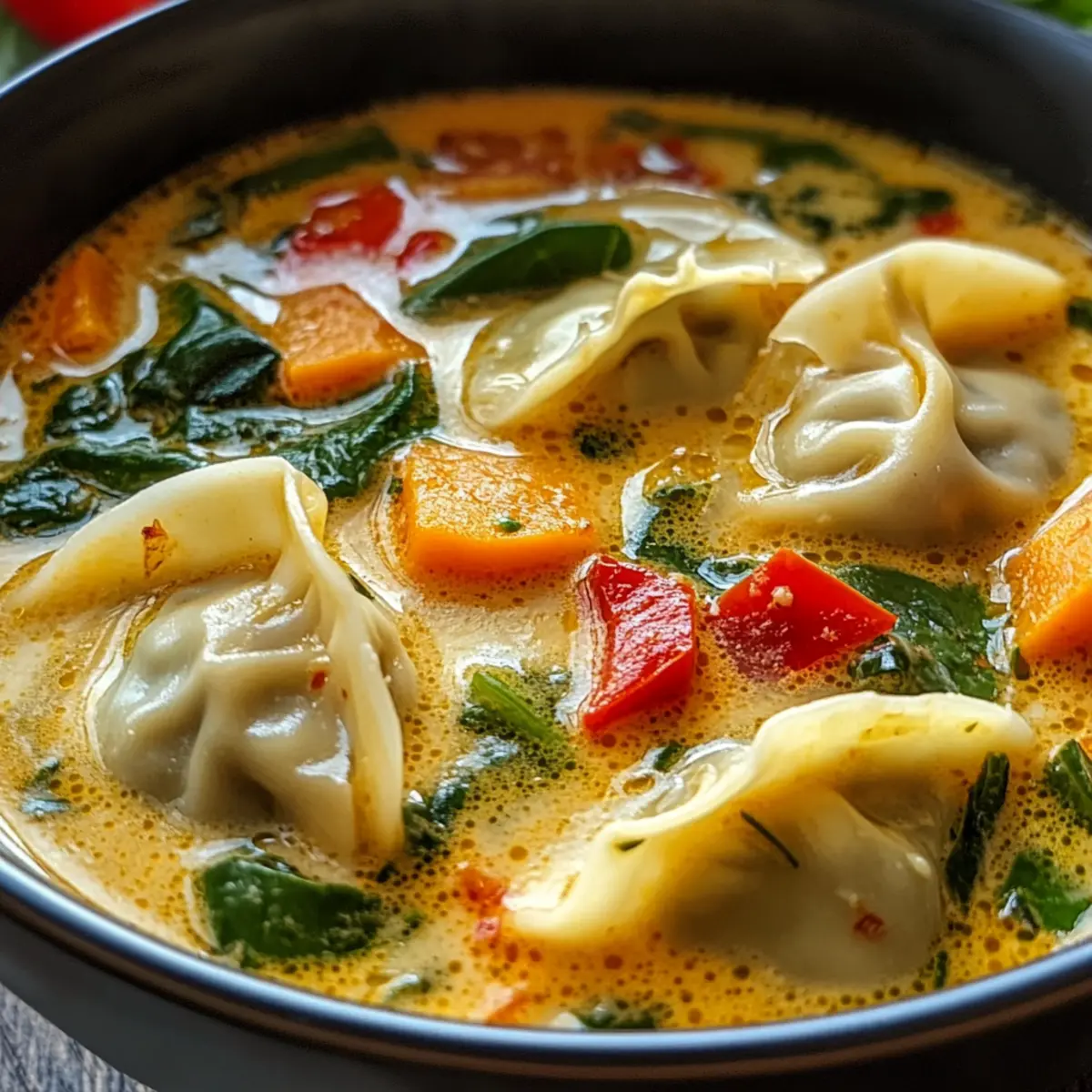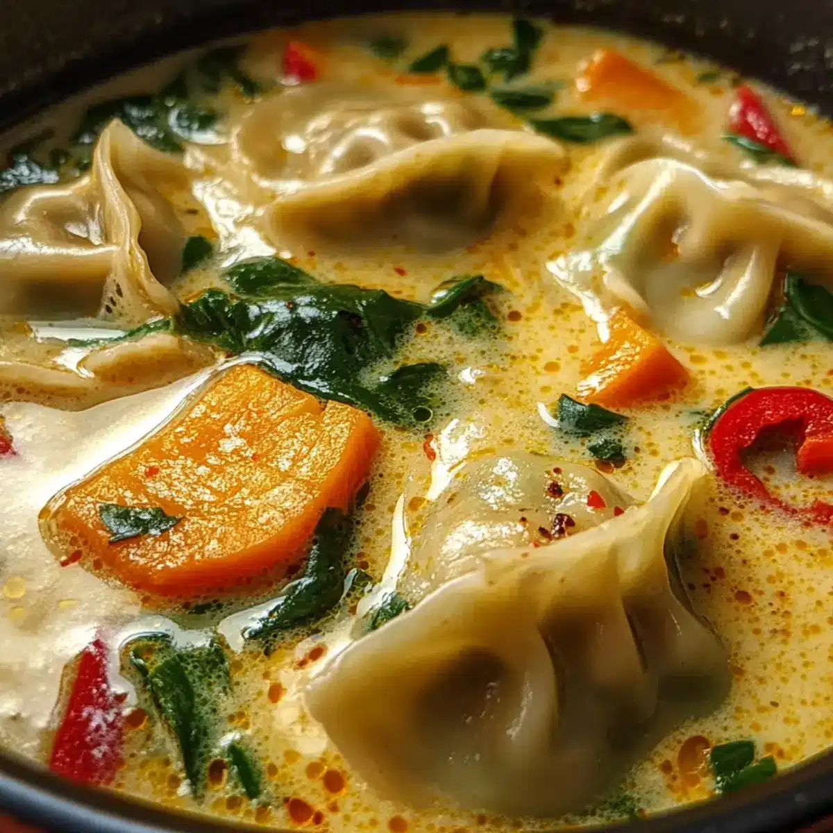 Vielfalt der Aromen: Die Kombination aus Kokosmilch und roter Currypaste bietet eine harmonische Balance aus Süße und Würze, während die Teigtaschen für das gewisse Etwas sorgen.
