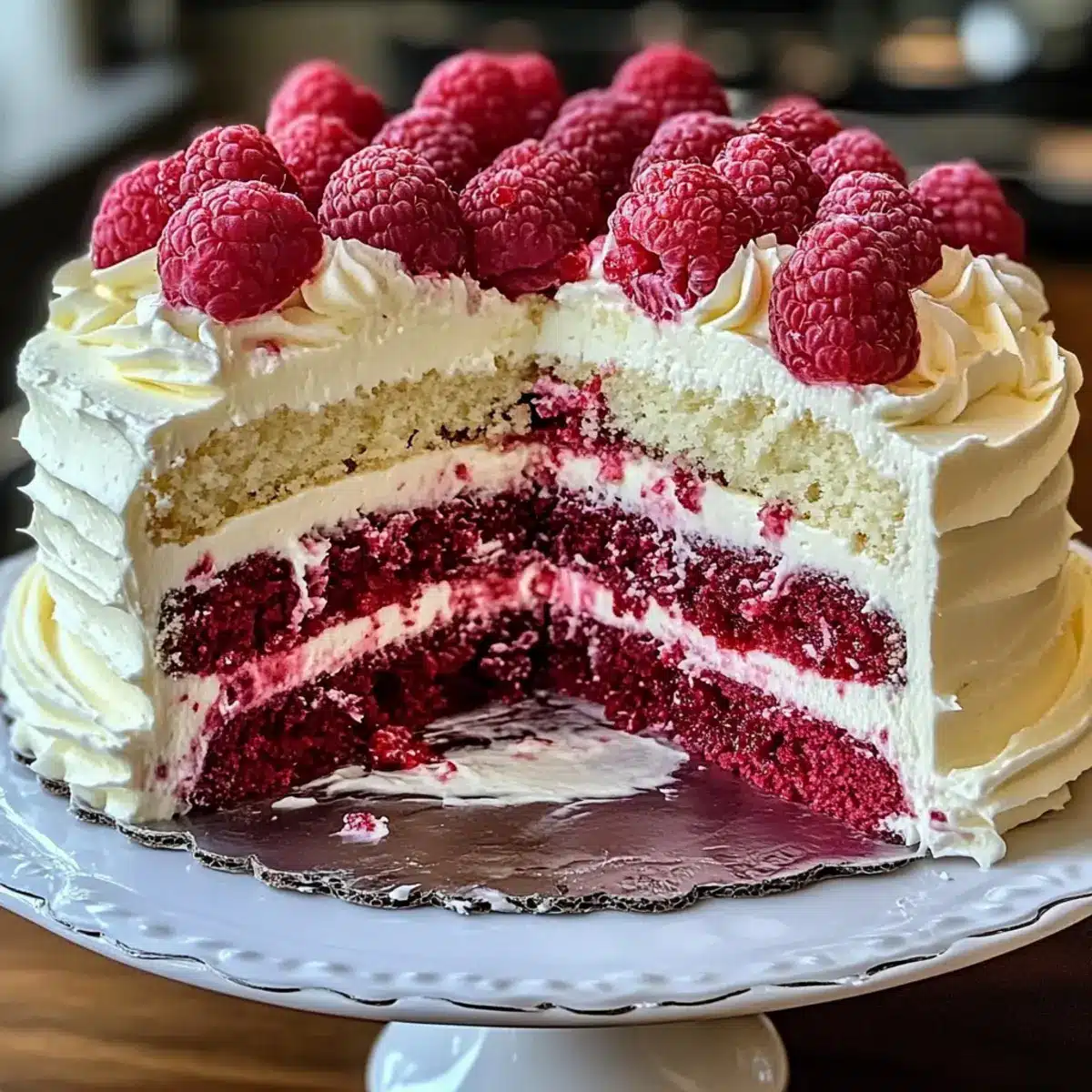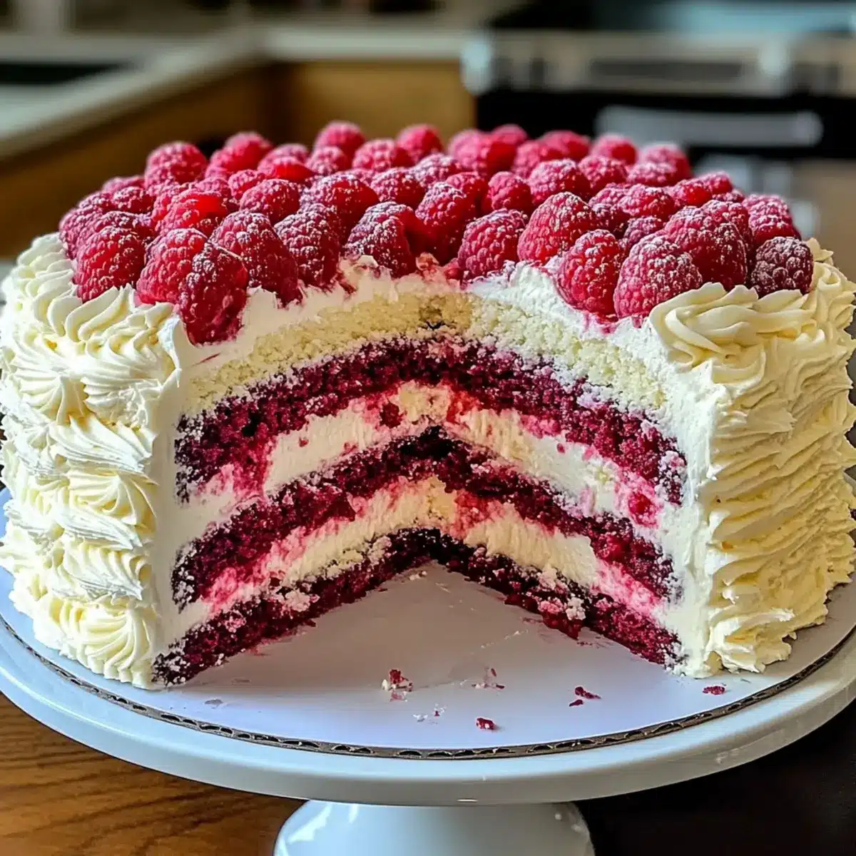 Schichte die abgekühlten Kuchen übereinander, wobei du zwischen den Schichten eine großzügige Menge der vorbereiteten Sahne aufträgst. Frostiere die Oberseite und die Seiten der Torte ebenfalls mit der restlichen Sahne. Garniere die Torte nach Belieben mit zusätzlichen Himbeeren und weißen Schokoladenraspeln für einen ansprechenden Look.